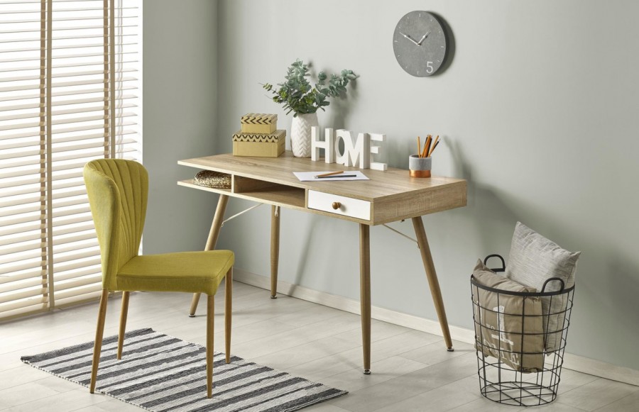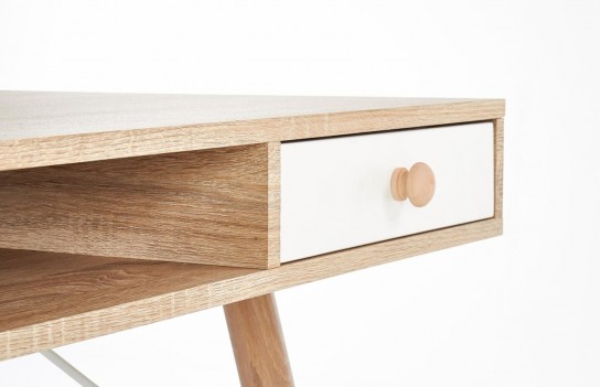 Biurko B34 - nowoczesne biurko w stylu skandynawskim. To idealny wybór dla osób urządzających pokój dla nastolatki. Blat biurka składa się z dwóch płyt MDF, co nadaje mu większą trwałość i wytrzymałość. Między płytami umieszczono jedną szufladę w kolorze białym, która pomieści niezbędne przybory szkolne lub inne drobiazgi. Obok szuflady znajduje się dodatkowa wolna przestrzeń na przechowywanie. Całość umieszczono na czterech nogach wykonanych ze stali malowanej proszkowo w naturalnym kolorze drewna.