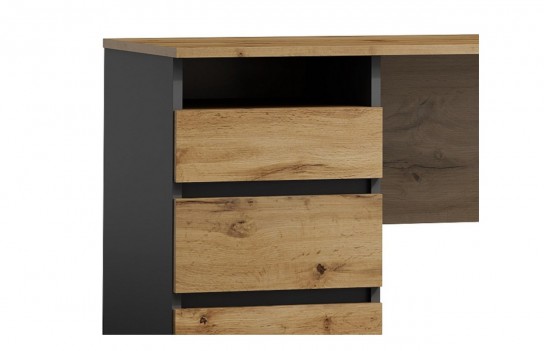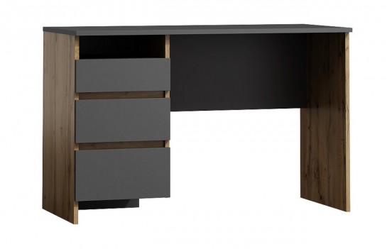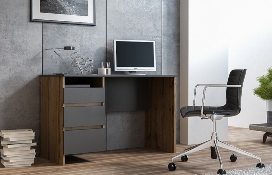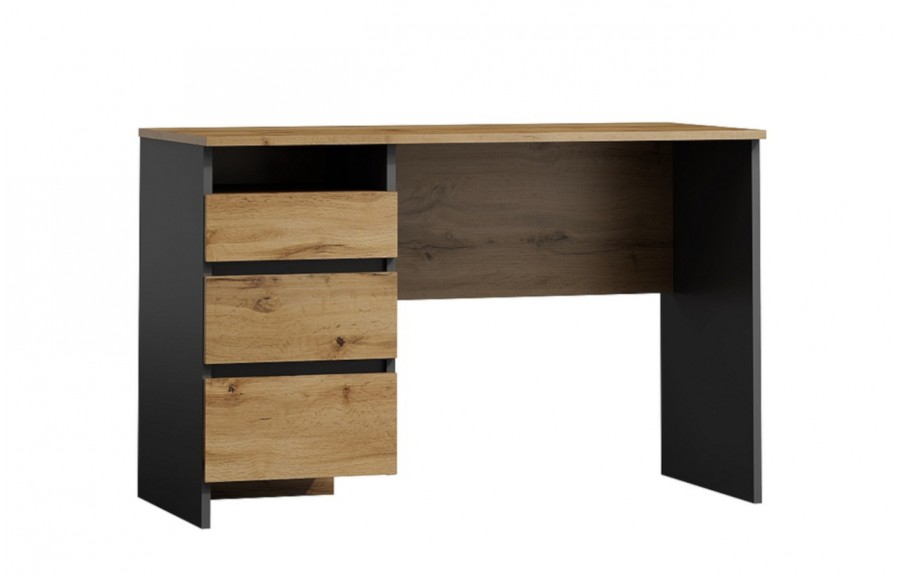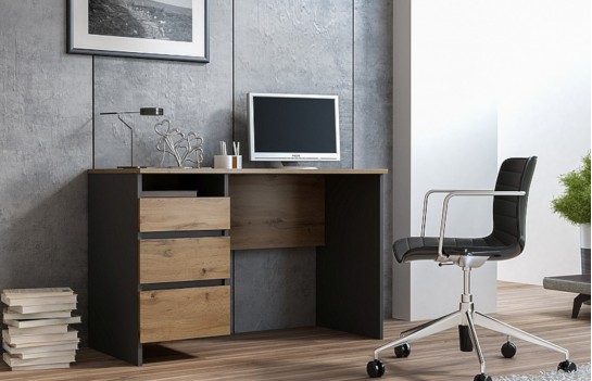 Biurko B-005 - tradycyjne biurko młodzieżowe. Mebel występuje w dwóch wersjach kolorystycznych i przeznaczony jest do gabinetu, biura, a także pokoju nastolatka. Ze względu na klasyczną konstrukcję, nieco surowy styl i ponadczasową kolorystykę, biurko będzie stanowiło modny oraz elegancki element wyposażenia. Warto także zwrócić uwagę na trzy funkcjonalne szuflady, dzięki którym możemy posegregować i uporządkować wszelkie dokumenty, przybory piśmiennicze czy akcesoria biurowe.
