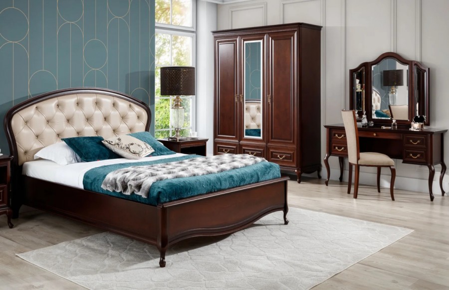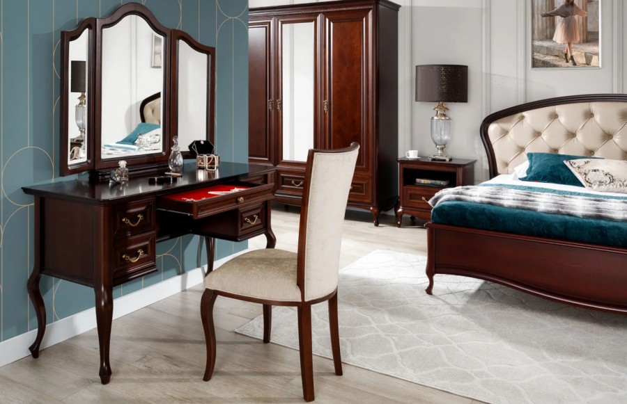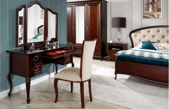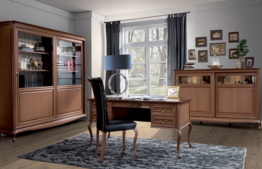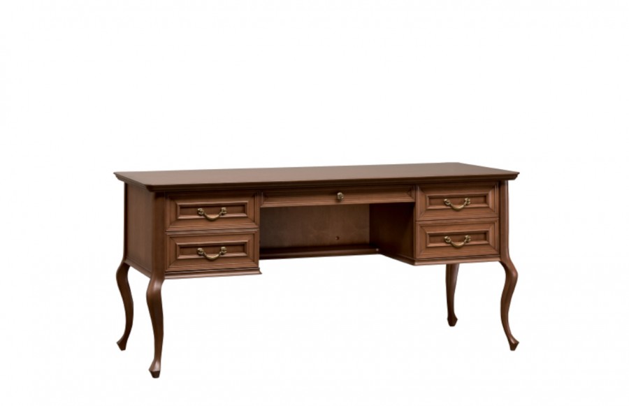 Biurko VERONA - emanuje klasycznym i eleganckim stylem. Wyróżniającą cechą tej kolekcji jest pięknie zdobiony wzór oraz eleganckie wykończenie, które nadają meblom klasyczny charakter. Biurko VERONA to doskonały dodatek do gabinetu lub sypialni, który nada aranżacji wyjątkowego charakteru. Biurko jest nie tylko eleganckie, ale również niezwykle pojemne, dzięki czterem wysuwanym szufladom z samodociągiem. Cała kompozycja mebla spoczywa na delikatnych, a jednocześnie solidnych nóżkach, nadając całości lekkości.