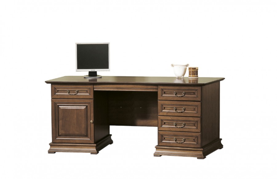 Biurko SENATOR - to sposób na pełen elegancji i funkcjonalności gabinet. Jego wspaniały wygląd z subtelnym zdobieniem i stylizowanymi uchwytami nawiązuje do klasycznego designu, dodając Twojej przestrzeni pracy wyjątkowego charakteru. To nie tylko mebel, ale również narzędzie do efektywnej pracy. Został wyposażony w niezbędne elementy ułatwiające codzienne zadania, takie jak szuflady, półki i szafki do przechowywania biurowych akcesoriów. Dodatkowo, płynnie zamykane fronty zapewniają komfort użytkowania. Konstrukcja biurka SENATOR została wykonana z naturalnych surowców, co gwarantuje nie tylko estetykę, ale także trwałość. Dzięki pięciu wysuwanym szufladom z samodociągiem oraz zamykanej szafce, biurko jest nie tylko eleganckie, ale również niezwykle pojemne. To niezwykła propozycja dla osób, które poszukują harmonijnego połączenia elegancji i funkcjonalności w jednym miejscu.