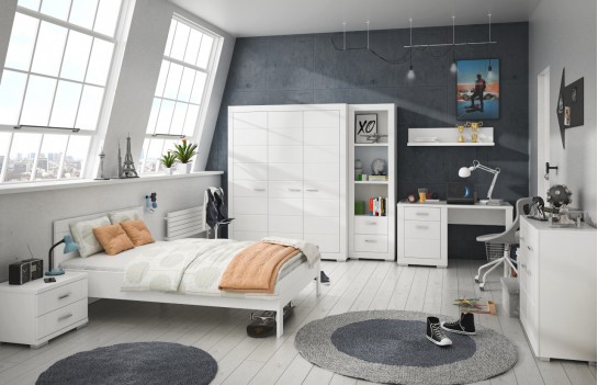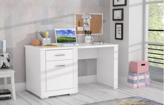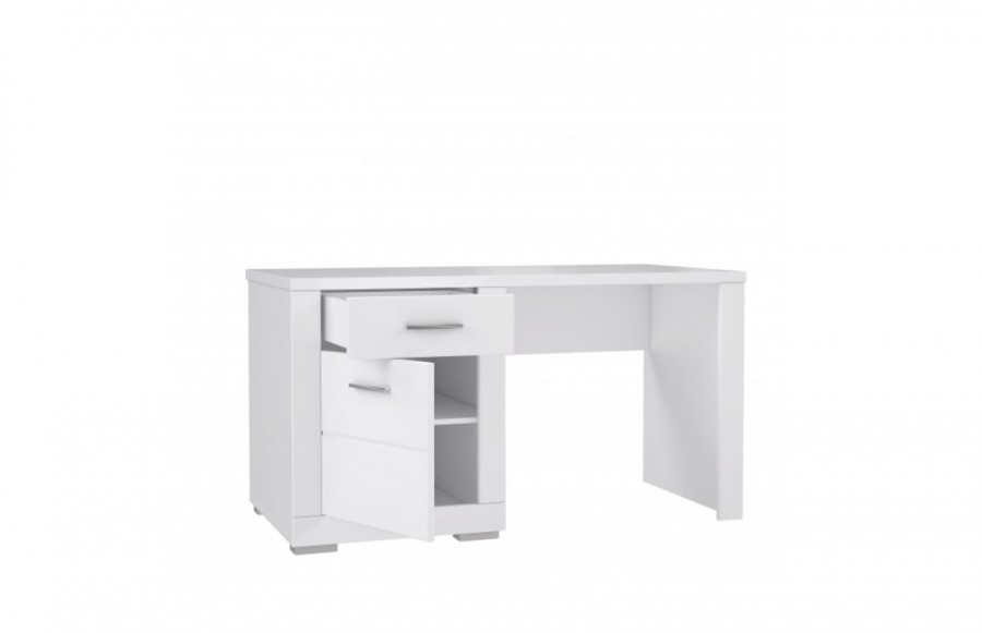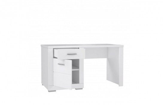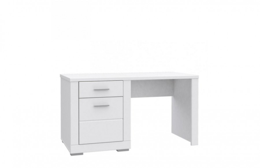 Biurko SNOW - w kolorze białym to idealny element aranżacji pokoju młodzieżowego, który nie tylko pięknie wygląda, ale także oferuje niezbędną funkcjonalność. To praktyczny mebel, na którym bez trudu pomieścisz wszystkie niezbędne rzeczy do pracy i nauki. Jego prosta forma, ozdobiona pogrubioną ramą i poziomym frezem na froncie, doskonale współgra z różnorodnymi kolorami, co daje Ci nieograniczone możliwości w kreowaniu własnych aranżacji. Biurko wyposażone jest w szafkę i szufladę, gdzie bez trudu schowasz wszystkie potrzebne przedmioty. Dzięki solidnej konstrukcji i metalowym uchwytom i nóżkom, to nie tylko elegancki, ale również solidny mebel, który doskonale sprawdzi się w codziennym użytkowaniu. Obszerny blat zapewnia mnóstwo miejsca do nauki i pracy, zapewniając komfortowe warunki do efektywnego działania.