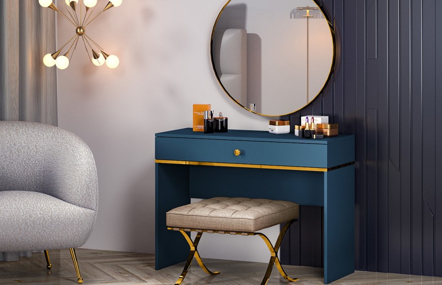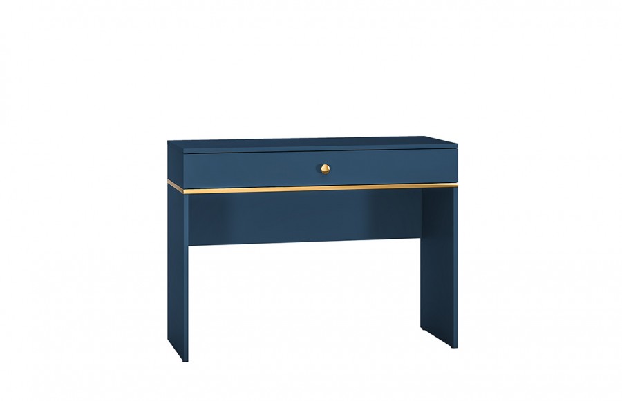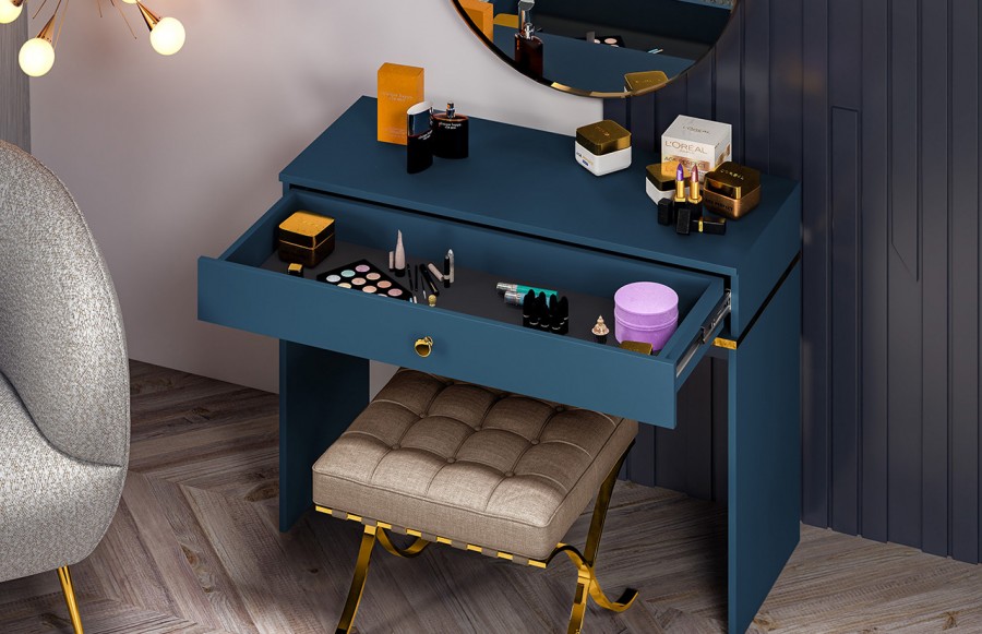 Toaletka MARINE 09 - ta toaletka to nie tylko mebel, to wyrazisty akcent, który wniesie wyjątkowy klimat do Twojej sypialni. Połączenie nowoczesnego designu z praktycznymi rozwiązaniami sprawia, że to niezwykły element wyposażenia. Jej elegancki wygląd z subtelnymi złotymi detalami dodaje luksusowego charakteru całej kompozycji. Toaletka MARINE 09 nie tylko wzbogaca stylizację przestrzeni, ale także przyciąga uwagę swoim wyrazistym designem. Dużą zaletą tego mebla jest pojemna szuflada, która zapewnia odpowiednią przestrzeń na przechowywanie kosmetyków, biżuterii oraz innych drobiazgów. Toaletka MARINE 09 to wyjątkowy element dekoracyjny. Jej niepowtarzalny design i doskonałe wykonanie sprawiają, że stanowi idealny wybór dla osób ceniących zarówno styl, jak i funkcjonalność.