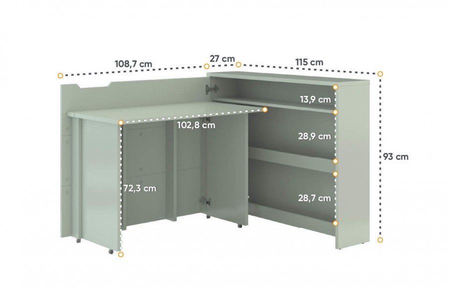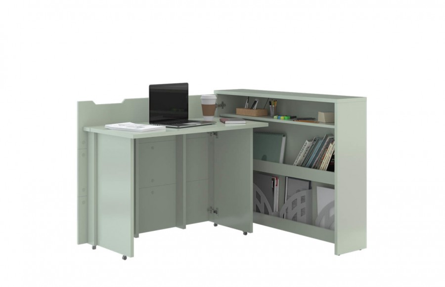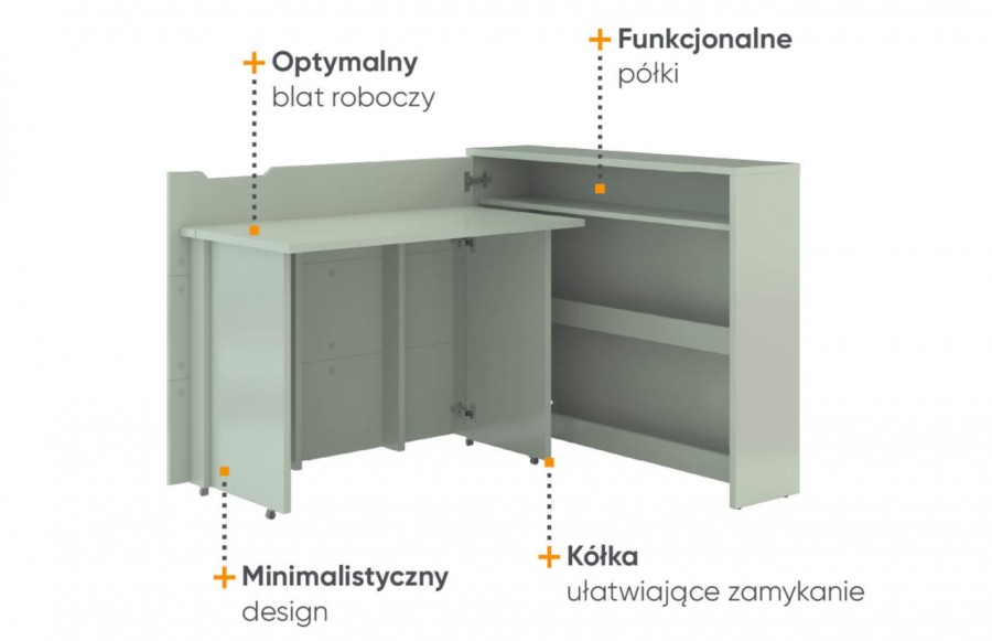 Biurko CW-01L SZAŁWIA - to praktyczne i wszechstronne biurko, które optymalnie wykorzystuje przestrzeń, idealne dla dzieci, nastolatków, jak i dorosłych w różnych wnętrzach. Dostępne w pięciu wariantach kolorystycznych (szałwia, biały mat, biały połysk, szary i dąb artisan), doskonale komponuje się z innymi meblami w mieszkaniu. Biurko oferuje wygodny blat roboczy i trzy półki do przechowywania książek, dokumentów oraz akcesoriów biurowych. Dzięki umieszczonym kółkom można łatwo i szybko zamknąć biurko, które po złożeniu przypomina zwykłą komodę, a jego blat można wykorzystać do eksponowania dekoracji. Dostępne w wersji prawej oraz lewej, biurko jest elastyczne i dopasowuje się do każdego pomieszczenia.