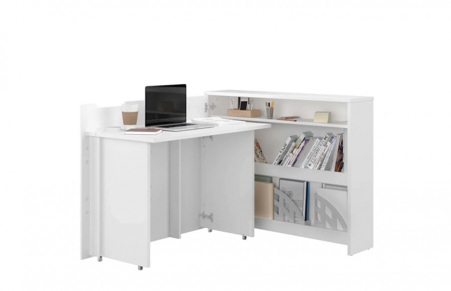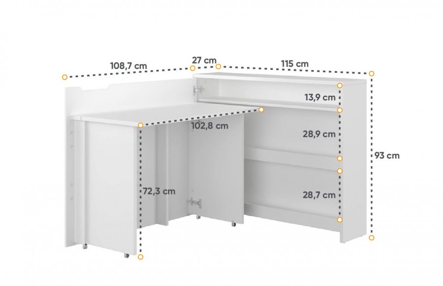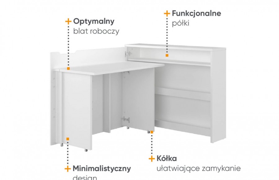 Biurko CW-01L POŁYSK - to praktyczne i wszechstronne biurko, które optymalnie wykorzystuje przestrzeń, idealne dla dzieci, nastolatków, jak i dorosłych w różnych wnętrzach. Dostępne w pięciu wariantach kolorystycznych (szałwia, biały mat, biały połysk, szary i dąb artisan), doskonale komponuje się z innymi meblami w mieszkaniu. Biurko oferuje wygodny blat roboczy i trzy półki do przechowywania książek, dokumentów oraz akcesoriów biurowych. Dzięki umieszczonym kółkom można łatwo i szybko zamknąć biurko, które po złożeniu przypomina zwykłą komodę, a jego blat można wykorzystać do eksponowania dekoracji. Dostępne w wersji prawej oraz lewej, biurko jest elastyczne i dopasowuje się do każdego pomieszczenia.
