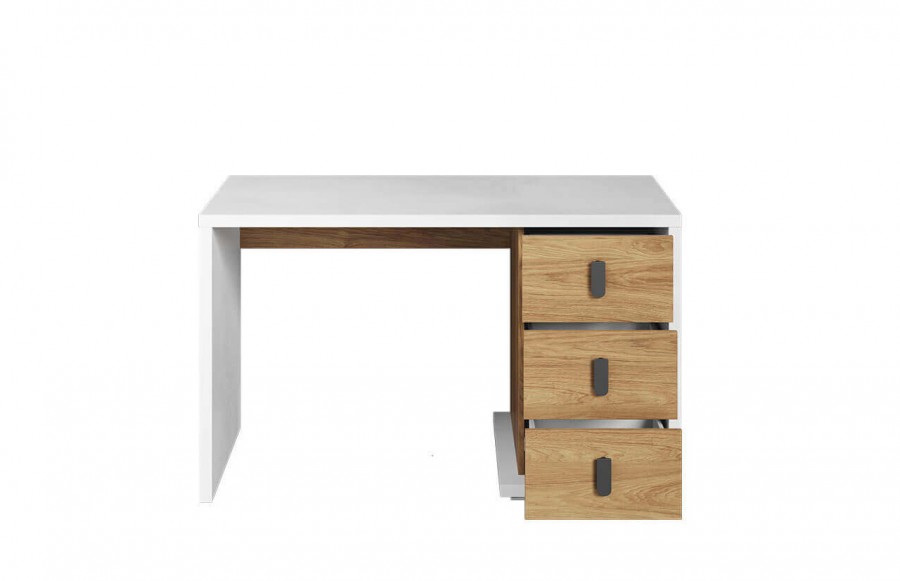 Biurko SIMI 06 - to modne biurko wyposażone w trzy pojemne szuflady. Jego ergonomiczny blat zapewnia dużą przestrzeń do wygodnej nauki. W szufladach łatwo pomieścisz wszystkie potrzebne akcesoria, mając je zawsze pod ręką. Styl tego mebla doskonale łączy nowoczesność z nutą tradycji. Zestawienie bieli z dekorem drewna nadaje mu ponadczasowy urok, który stworzy przytulną aranżację w każdym wnętrzu. Wyjątkowy efekt tworzy masywny blat i korpus, a cofnięte fronty szuflad dodają mu modnego charakteru. Mebel wykonano z wytrzymałej płyty laminowanej, z trwałym obrzeżem ABS, zapewniając nie tylko atrakcyjny wygląd, ale także solidność i trwałość.