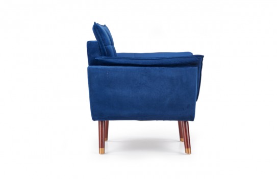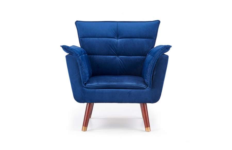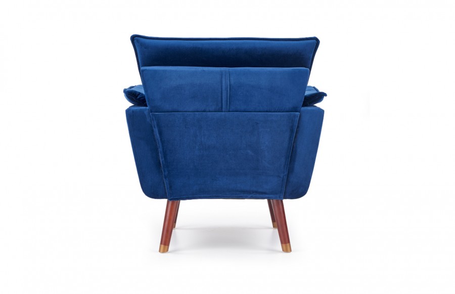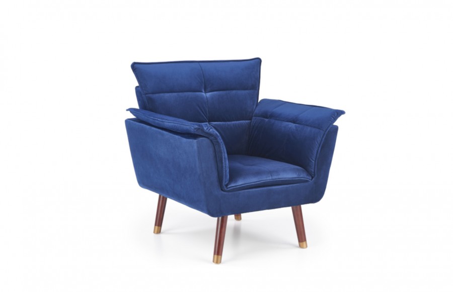 Fotel REZZO - to połączenie nowoczesnego designu z wygodą użytkowania. Tapicerowany wysokiej jakości tkaniną imitującą aksamit, nadaje wnętrzu elegancji. Stabilna konstrukcja na nóżkach z drewna kauczukowego w ciemnym odcieniu orzecha, zakończonych złotymi wstawkami. Tkanina w głębokim granatowym kolorze nadaje fotelowi wyrafinowanego wyglądu. Idealny do wnętrz monochromatycznych, zapewniający elegancję i wygodę dzięki miękkim podłokietnikom.