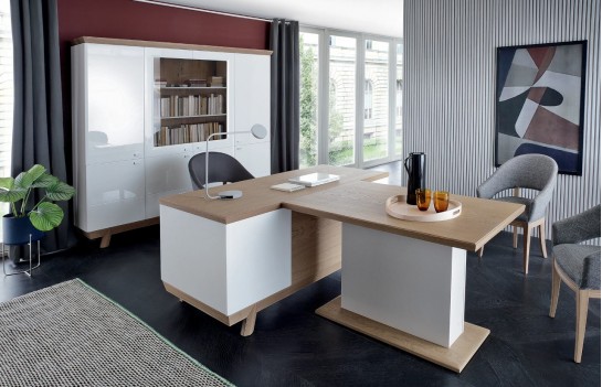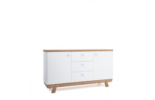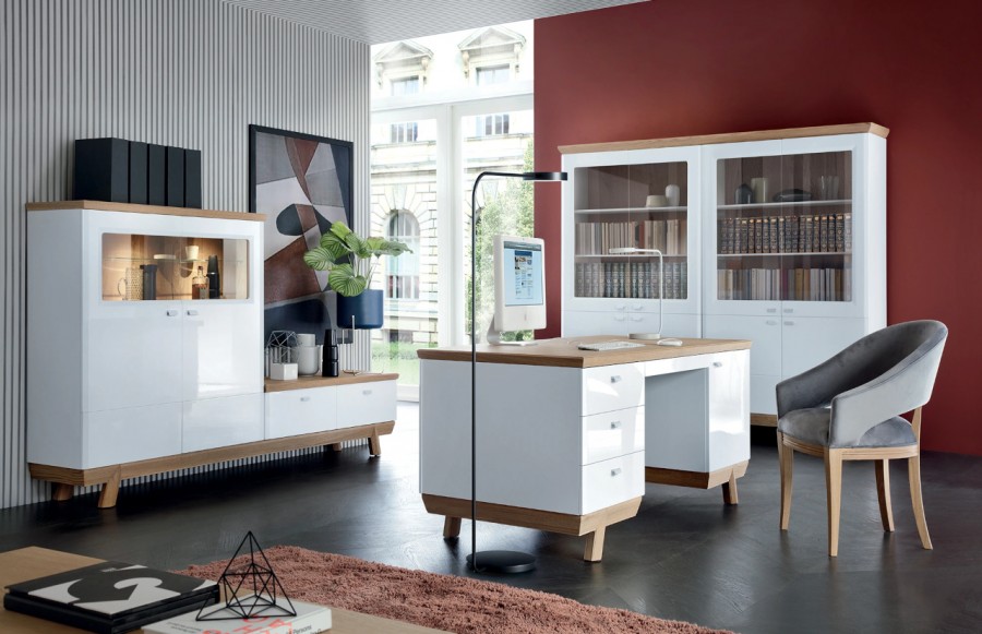 Gabinet ASPEN - to kolekcja gdzie nowoczesność spotyka elegancję poprzez harmonijne zestawienie drewna z białym połyskiem. Unikalnym atutem kolekcji jest również fakt, że meble te oparte są na delikatnych nóżkach, co dodaje im lekkości i nawiązuje do stylu skandynawskiego. ASPEN to propozycja prostego minimalizmu, idealnie pasująca do każdego gabinetu. Wykończenie mebli białym połyskiem sprawi, że pomieszczenie nabierze dodatkowego blasku. Fronty odbijając światło sprawią, że biuro stanie się bardziej luksusowe oraz przestronne. Kolekcja ASPEN doskonale sprawdzi się w niewielkich przestrzeniach, dodając im nowoczesności i stylu. Bogata oferta linii mebli ASPEN obejmuje różnorodne elementy, które możemy dostosować do naszych potrzeb. Wybór mebli pomiędzy bryłami zamkniętymi w postaci komód a dużymi witrynami z przeszkleniami daje możliwość tworzenia unikalnych aranżacji. Szczególnie warto podkreślić duże, wygodne biurko, które jest niekwestionowanym atutem tej kolekcji. Z jednej strony mamy praktyczne szuflady, a z drugiej funkcjonalną szafkę. Rozmiar biurka pozwoli na swobodne korzystanie z komputera czy laptopa, a także na wygodne rozłożenie dokumentów. Dodatkowo, będzie idealnym miejscem na chwilę relaksu z kawą. Kolekcja ASPEN to solidne i wytrzymałe meble, które harmonijnie łączą w sobie minimalizm i elegancję.