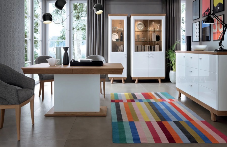 Jadalnia ASPEN - to kolekcja, w której nowoczesność spotyka się z elegancją poprzez harmonijne zestawienie drewna z białym połyskiem. Unikalnym atutem kolekcji jest fakt, że meble te oparte są na delikatnych nóżkach, co dodaje im lekkości i nawiązuje do stylu skandynawskiego. ASPEN to propozycja prostego minimalizmu, idealnie pasująca do każdego wnętrza. Wykończenie mebli białym połyskiem sprawi, że pomieszczenie nabierze dodatkowego blasku, a odbijające światło fronty sprawią, że jadalnia stanie się bardziej luksusowa i przestronna. Kolekcja ASPEN doskonale sprawdzi się w niewielkich przestrzeniach, dodając im nowoczesności i stylu. Bogata oferta linii mebli ASPEN obejmuje różnorodne elementy, które możemy dostosować do naszych potrzeb. Wybór mebli pomiędzy bryłami zamkniętymi w postaci komód a dużymi witrynami z przeszkleniami daje możliwość tworzenia unikalnych aranżacji. Stół ASPEN to niezwykła propozycja dla osób poszukujących elegancji i funkcjonalności w jednym. Ten rozkładany stół o wymiarze 160 cm może osiągnąć długość 210 cm, co zapewnia dużo miejsca dla rodziny i gości. Kolekcja ASPEN emanuje ciepłem i spokojem, tworząc przytulną atmosferę. Innowacyjne ledowe oświetlenie półek, z eleganckim bezdotykowym włącznikiem, to nie tylko praktyczne rozwiązanie, ale także element nadający wnętrzu wyjątkowego charakteru. Kolekcja ASPEN to solidne i wytrzymałe meble, które harmonijnie łączą w sobie minimalizm i elegancję.
