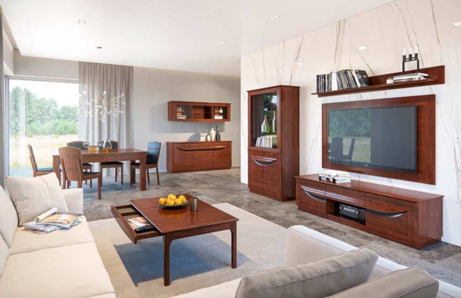 Jadalnia BARI - to kolekcja niezwykle ekskluzywnych mebli dla Twojego wnętrza. Wyjątkowe materiały, takie jak szlachetne drewno oraz naturalna okleina w kolorze dębu burgundzkiego, gwarantują najwyższą jakość i trwałość. Prosta, a jednocześnie niebanalna forma, zachwyca detalem, a wygodne rozwiązanie push-to-open oraz oświetlenie LED tworzą receptę na nowoczesne i harmonijne zaaranżowanie jadalni. Kolekcja mebli BARI to połączenie elegancji, stylu oraz nieograniczonych możliwości aranżacyjnych. To propozycja, która nie tylko spełni Twoje oczekiwania teraz, ale również będzie pięknie prezentować się przez lata, niezależnie od zmieniających się trendów. Kolekcja oferuje szeroki wybór brył, w tym przestronne witryny, komody, barki, szafki pod telewizor, regały oraz stoliki kawowe. Oczywiście, nie można pominąć również stołów i krzeseł, które doskonale uzupełnią Twoje wnętrze. Stoły dostępne w różnych rozmiarach i kształtach pozwalają znaleźć idealny model dopasowany do Twojej przestrzeni. Unikalne wzory stolików kawowych dodają odrobinę kreatywności do Twojej przestrzeni życiowej, tworząc wyjątkową atmosferę. Witryny i komody zostały zaprojektowane z myślą o praktycznym przechowywaniu niezbędnych artykułów spożywczych. Dzięki bogatej ofercie kolekcji, mamy możliwość swobodnego zestawiania elementów tak, aby stworzyć idealną aranżację jadalni, optymalnie wykorzystując dostępną przestrzeń. Kolekcja BARI to gwarancja funkcjonalności, nowoczesnego designu i wyjątkowej atmosfery w Twoim wnętrzu.