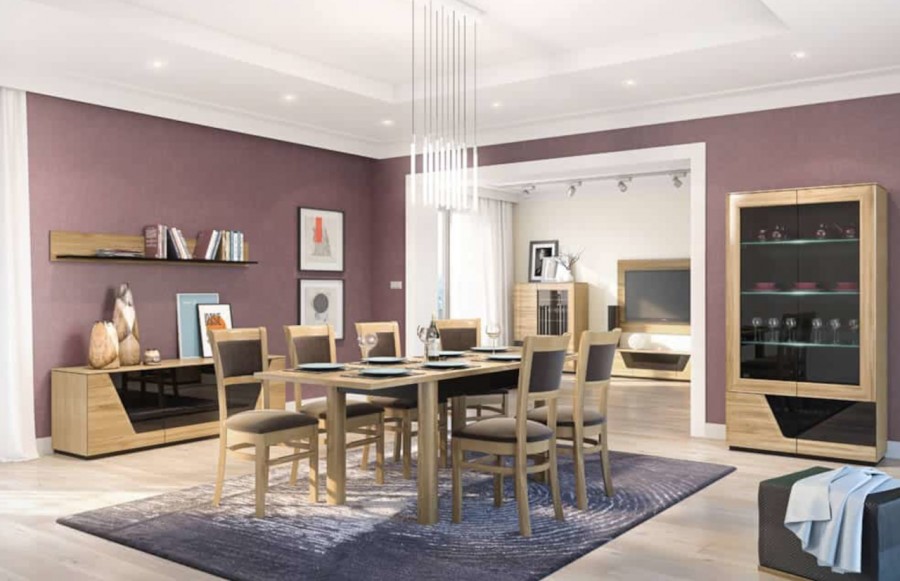 Jadalnia SMART - to kwintesencja elegancji w meblarstwie, stworzona z myślą o Twojej jadalni, salonie i sypialni. Z wykorzystaniem naturalnego drewna dębowego i oklein dębowych, te meble wyróżniają się doskonałym wzornictwem i perfekcyjnym wykończeniem. Dostępne w dwóch wariantach kolorystycznych - jasnym dębie naturalnym lub ciemnym orzechu antycznym, z subtelnymi czarnymi akcentami, kolekcja zachwyca swoją uniwersalnością, nadając Twojemu wnętrzu ciepłą i elegancką atmosferę. Nowoczesne punkty świetlne LED, umieszczone z tyłu szklanych półek, dyskretnie podkreślają zawartość witryn, witrynek i komód. Dzięki zastosowaniu mechanizmu push to open, szuflady cicho i łatwo się wysuwają. Bogaty wybór mebli w kolekcji SMART obejmuje witryny, witryny z oświetleniem, komody, szafki z barkiem, półki wiszące oraz panele TV. Szczególnie warto zwrócić uwagę na stoły oraz stoliki o różnych rozmiarach i kształtach, jak rozsuwany ławostół z automatycznym podnoszeniem blatu. Kolekcja SMART to więcej niż tylko meble - to obietnica stworzenia niepowtarzalnej atmosfery w Twoim domu, gdzie nowoczesny design spotyka się z funkcjonalnością i elegancją. Dzięki naszej różnorodnej ofercie, możesz swobodnie zestawić meble, tworząc idealną aranżację jadalni, która doskonale wykorzystuje dostępną przestrzeń. Przekonaj się sam, jak kolekcja SMART podkreśli charakter Twojego wnętrza, łącząc wyrafinowany styl z wygodą i nowoczesnością.