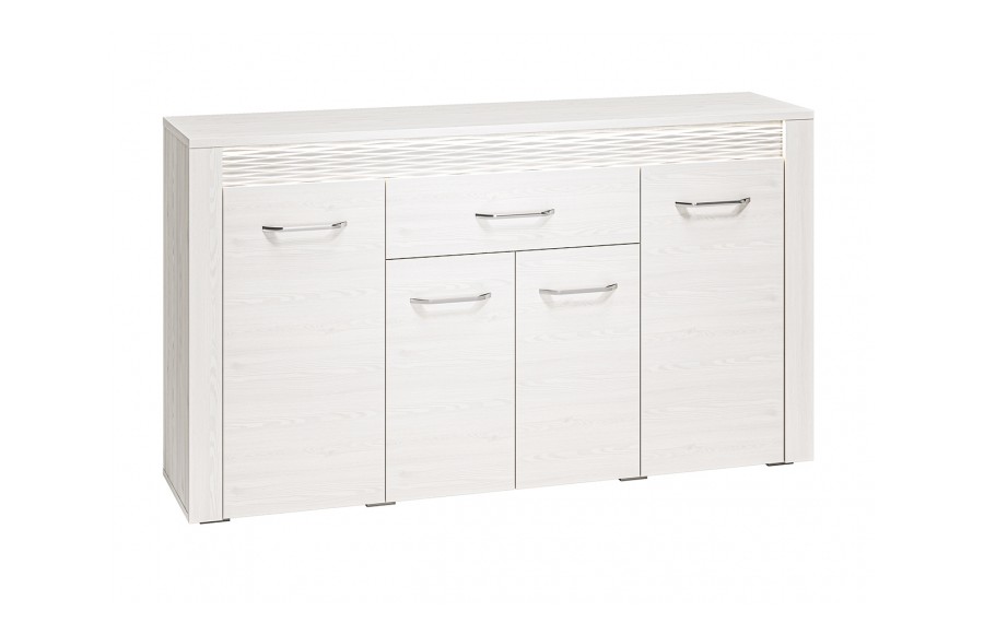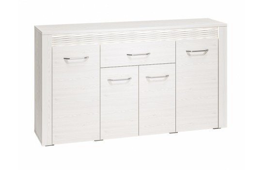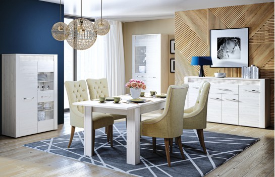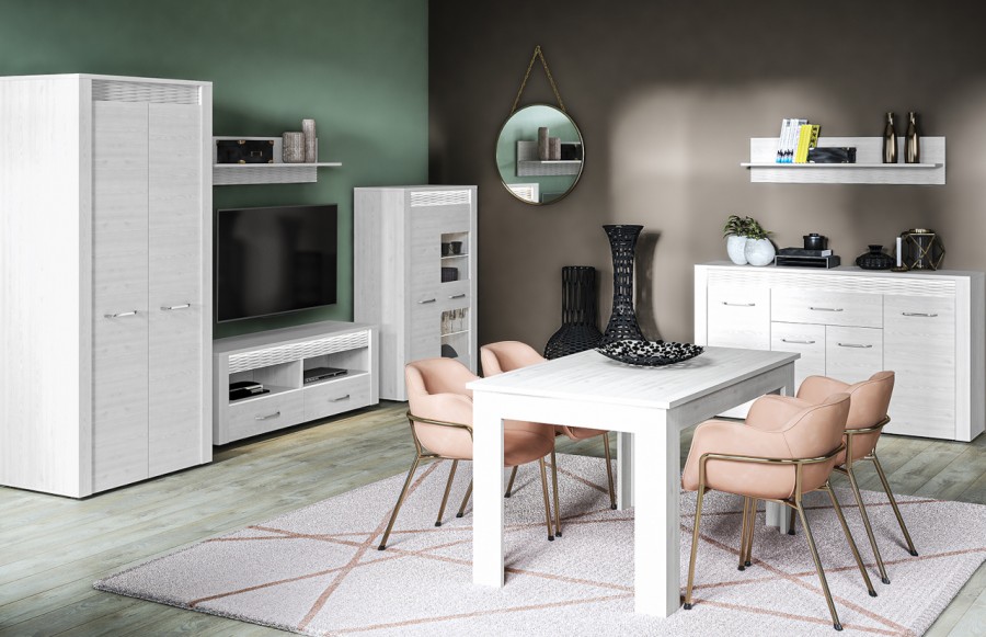 Jadalnia CLERMONT - to hołd dla współczesnego designu, łączący w sobie modny wygląd z funkcjonalnością. Dekor Sosny Śnieżnej z subtelnym wzorem usłojenia, wraz z podświetlaną, ryflowaną wstawką MDF, tworzy wyjątkowy zestaw. Bielona imitacja drewna rozświetli Twój pokój, dodając mu elegancji i wyrafinowanego stylu. Klasyczne bryły mebli, uzupełnione chromowanymi, metalowymi uchwytami, emanują ponadczasową klasyką i szykiem. Kolekcja CLERMONT oferuje szeroki wybór brył, doskonale pasujących zarówno do salonu, jak i jadalni. Ta seria mebli daje Ci możliwość tworzenia trwałych i praktycznych aranżacji w przystępnych cenach. W jej asortymencie znajdziesz szafy, stolik, szafkę RTV do salonu oraz witryny i stół idealne do jadalni. Proste linie i solidne wykonanie, dbałość o detale – to cechy, które zapewniają, że meble z tej kolekcji posłużą Ci na lata. Pozwól sobie na kreatywność, komponując różne elementy w spójne aranżacje. Stoły do jadalni z serii CLERMONT łączą w sobie styl i funkcjonalność, zapewniając wygodne miejsce dla wszystkich gości. Dzięki możliwości rozkładania, zapewniają swobodę i komfort podczas posiłków, bez obaw o brak miejsca. Jeśli szukasz wyjątkowego charakteru dla swojej jadalni, kolekcja CLERMONT spełni Twoje oczekiwania. Jako serce domu, jadalnia zasługuje na staranne urządzenie, a meble z kolekcji CLERMONT zapewnią Ci nie tylko estetykę, ale także funkcjonalność, eliminując nieład i chaos z Twojego wnętrza.
