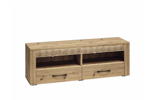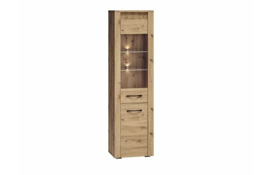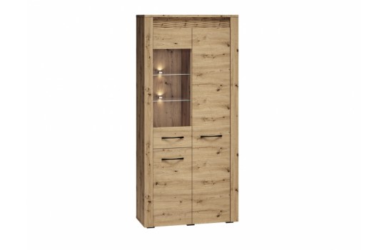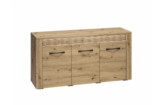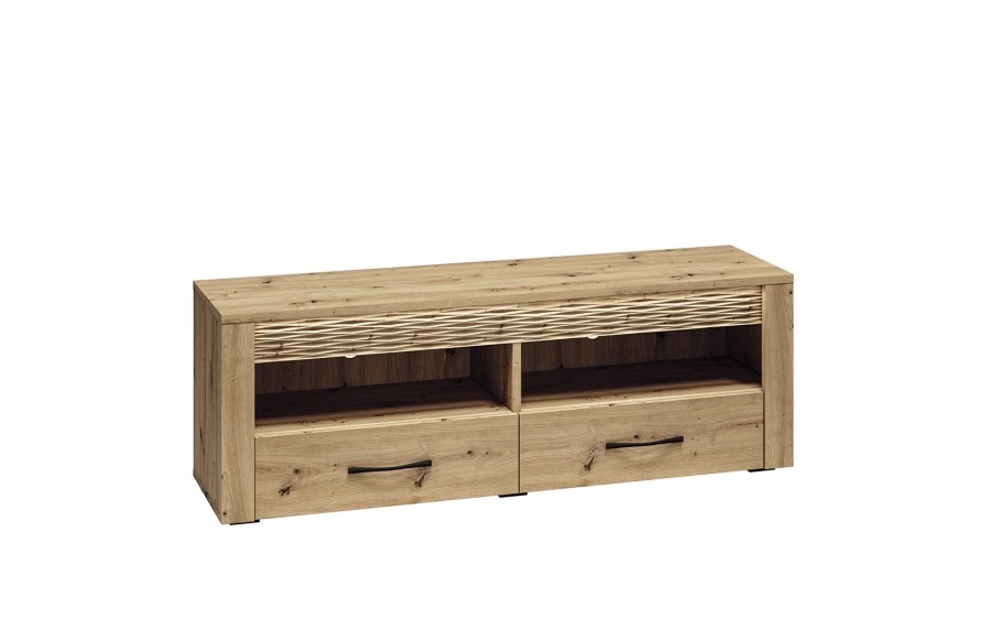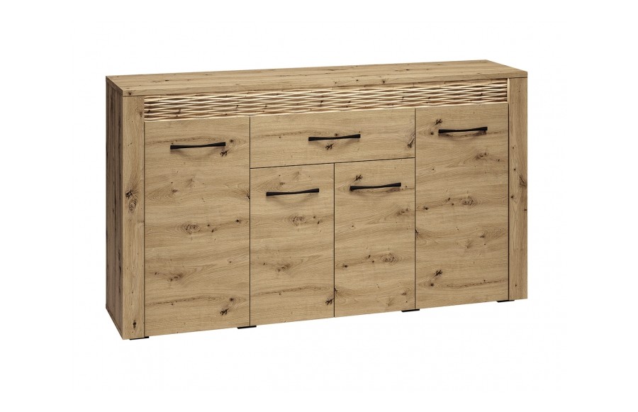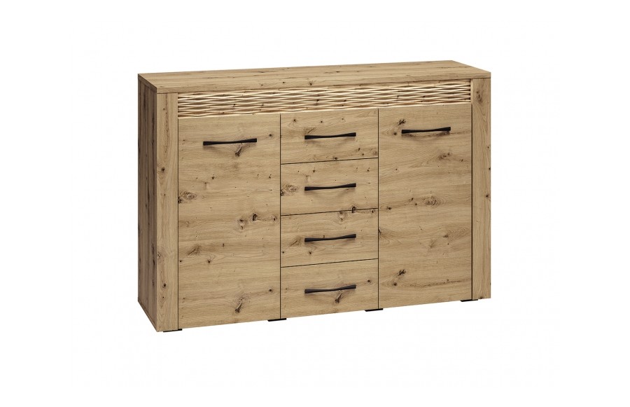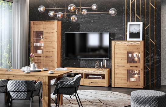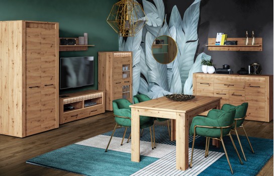 Jadalnia ARTIS - odkryj nowoczesność zainspirowaną naturą dzięki starannie zaprojektowanej kolekcji mebli ARTIS. Wyjątkowy charakter mebli podkreśla naturalny rysunek drewna, jego piękne usłojenie oraz wyraźne sęki. Te elementy, połączone z wyważoną i prostą stylistyką, tworzą niezwykły duet, który odmieni każde wnętrze. Czarny, metalowy uchwyt doskonale kontrastuje z ciepłym dekorem dębu, a podświetlana, dekoracyjna ryfla dodaje Twojemu wnętrzu blasku i niepowtarzalnego klimatu. Jednym z najbardziej wyróżniających się elementów mebli ARTIS są oryginalne wstawki z ryflowanej płyty MDF, które dodają unikalnego charakteru. Dodatkowo, w komodach, witrynie niskiej oraz szafce RTV wstawki te są podświetlane, tworząc efektowne akcenty świetlne. Opcjonalnie, szklane półki w witrynach również mogą być podświetlane, co dodaje wnętrzu jeszcze więcej elegancji. Szuflady w komodach zostały specjalnie zaprojektowane z myślą o zwiększonej ładowności, dzięki specjalnemu wzmocnieniu dna oraz możliwości pełnego wysuwu. Kolekcja ARTIS oferuje bogaty wybór mebli, od przestronnych witryn i komód po szafki pod telewizor oraz stoliki kawowe. Stoły i krzesła są również nieodłącznym elementem tej kolekcji, pozwalając na dopasowanie do różnych rozmiarów i kształtów przestrzeni. Witryny i komody zostały starannie zaprojektowane z myślą o praktycznym przechowywaniu niezbędnych artykułów spożywczych, łącząc funkcjonalność z estetyką. Bogata oferta kolekcji ARTIS daje możliwość swobodnego zestawiania elementów, umożliwiając stworzenie idealnej aranżacji jadalni, która doskonale wykorzystuje dostępną przestrzeń. Kolekcja ARTIS to nie tylko gwarancja funkcjonalności i nowoczesnego designu, ale także obietnica stworzenia wyjątkowej atmosfery w Twoim domu, gdzie wyrafinowany styl spotyka się z komfortem i elegancją.