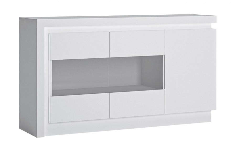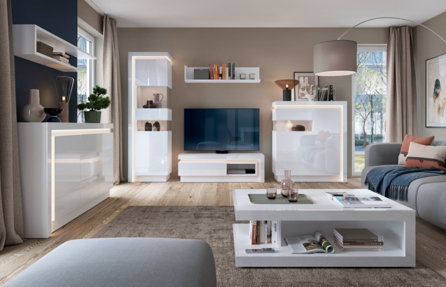 Jadalnia LYON BIAŁY - łączy w sobie elegancję i funkcjonalność, doskonale pasując zarówno do jadalni, jak i salonu. Ich minimalistyczna kolorystyka oraz intrygujące kształty pozwalają dopasować je do różnych stylów aranżacyjnych, a biała powierzchnia połysku doskonale odbija światło, sprawiając, że przestrzeń wydaje się większa i jaśniejsza. Geometryczny kształt, proste linie oraz eleganckie przeszklenia witryn tworzą unikalny styl mebli. Wykonane z płyty laminowanej, są odporne na zarysowania, uszkodzenia, wilgoć i wysoką temperaturę. Wyjątkowym elementem kolekcji LYON jest podświetlenie ciepłym światłem ledowym, które dodaje wyjątkowego charakteru poszczególnym bryłom. Dodatkowo, zastosowane prowadnice i zawiasy z systemem cichego domykania oraz płyta laminowana na blatach mebli zapewniają wygodę użytkowania i trwałość. Kolekcja oferuje szeroki wybór brył, w tym przestronne witryny, komody, barkek, szafki pod telewizor, regał oraz stoliki kawowe. Oczywiście, nie można pominąć również stołu i krzeseł, które doskonale uzupełnią Twoje wnętrze. Witryny i komody zostały zaprojektowane z myślą o praktycznym przechowywaniu niezbędnych artykułów spożywczych. Wybierając meble z kolekcji LYON do swojej jadalni, nie tylko optycznie powiększysz i rozświetlisz przestrzeń, ale również stworzysz niezapomniany, elegancki klimat, który zachwyci Twoich gości i sprawi, że Twój dom stanie się miejscem wyjątkowym.