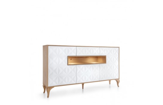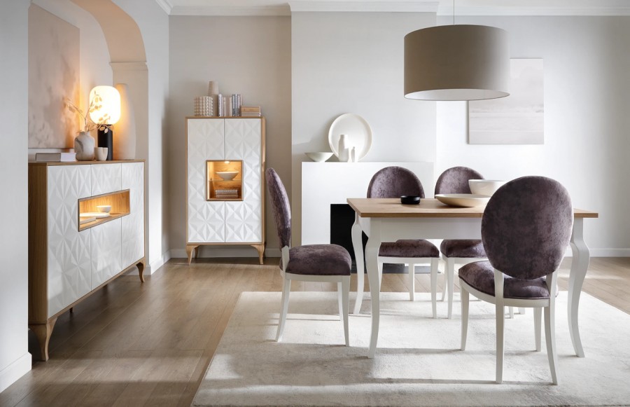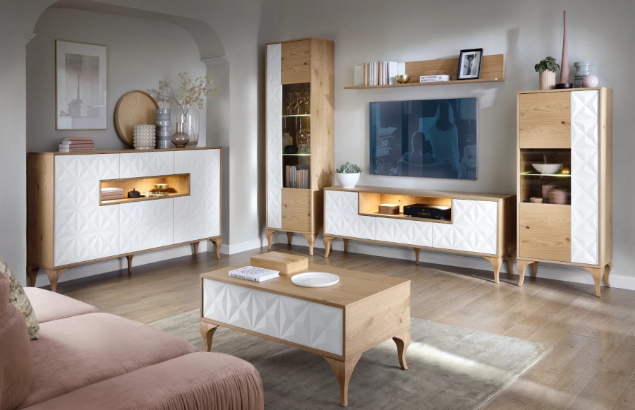 Jadalnia DIAMENT - to kolekcja o nowoczesnym wyglądzie i gwarancja funkcjonalności oraz stylu. Każdy moduł został przemyślany, by doskonale wykorzystać dostępną przestrzeń, zapewniając jednocześnie maksimum wygody użytkowania. Unikalny design kolekcji DIAMENT tworzy otwartą przestrzeń wewnątrz mebli, dając Ci dużą swobodę w eksponowaniu ulubionych dekoracji oraz pamiątek. Stworzono ją z drewna dębowego, okleinowanej płyty meblowej oraz matowej okleiny PCF na płycie MDF. Dostępna w dwóch kolorach: bieli i grafitu, pozwalają na kreowanie różnych aranżacji. Dzięki zmiennym odcieniom światła oraz unikalnemu wzorowi na froncie, meble Kolekcji DIAMENT nabierają charakteru oraz wyjątkowości. Kolekcja DIAMENT to więcej niż tylko wzór na froncie. Gięte nogi unoszą mebel i nadają mu lekkości, tworząc równowagę pomiędzy designem a praktycznością. Stół, o wymiarze 140 cm przed rozłożeniem, zmienia się w wygodny stół, który pomieści nawet 10-12 osób. Dzięki niemu, bez obaw o brak miejsca, możesz gościć swoich bliskich. Kolekcja DIAMENT to propozycja dla osób szukających oryginalnych wzorów oraz rozwiązań. Odkryj nowoczesny styl w kolekcji DIAMENT i podkreśl swój wyjątkowy gust w Twoim wnętrzu.
