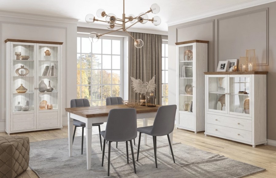 Jadalnia EVORA - to niezastąpiony dodatek do Twojego klasycznego wnętrza. Jej eleganckie akcenty wprowadzą wyrafinowany styl do Twojego domu. Meble tej serii dostępne są w dwóch odsłonach kolorystycznych, zielonym z dębem Ribbeco oraz Abisko Ash z dębem Lefkas (biały), co pozwala dostosować kolekcję do Twojego gustu. EVORA to seria mebli, która wspaniale wkomponuje się zarówno w pokoju dziennym, salonie, jak i jadalni. Oferujemy szeroki wybór komód, witryn, stolików RTV i wiszących półek, abyś mógł stworzyć kompleksowe aranżacje, oddając charakter Twojego wnętrza. Dodatkowo, w kolekcji znajdziesz również stylowy stolik kawowy oraz praktyczny stół rozkładany, który doskonale spełni swoją rolę w jadalni. Stół EVORA emanuje nowoczesną i minimalistyczną stylistyką. To mebel nie tylko praktyczny, ale i estetyczny, który świetnie dopełni każde wnętrze. Jego regulowany rozmiar to niewątpliwie atut, który umożliwia łatwą modyfikację według Twoich potrzeb. Kolekcja EVORA nie tylko podkreśla elegancję, ale także oferuje funkcjonalność i trwałość. Meble zostały solidnie wykonane, aby sprostać Twoim oczekiwaniom na wiele lat. Co więcej, dodatkowe oświetlenie LED to kolejny atut, który pozwoli Ci stworzyć niezwykłą atmosferę w Twoim wnętrzu.