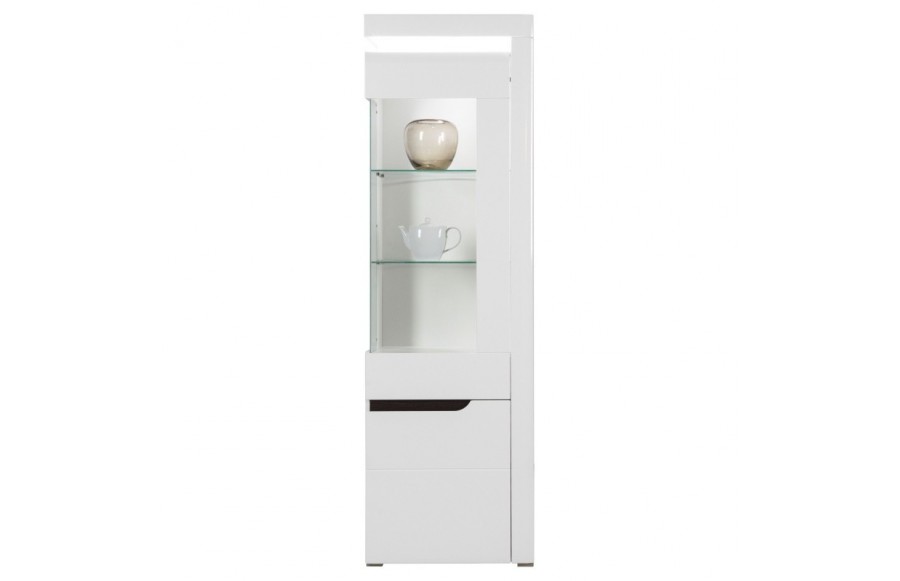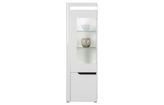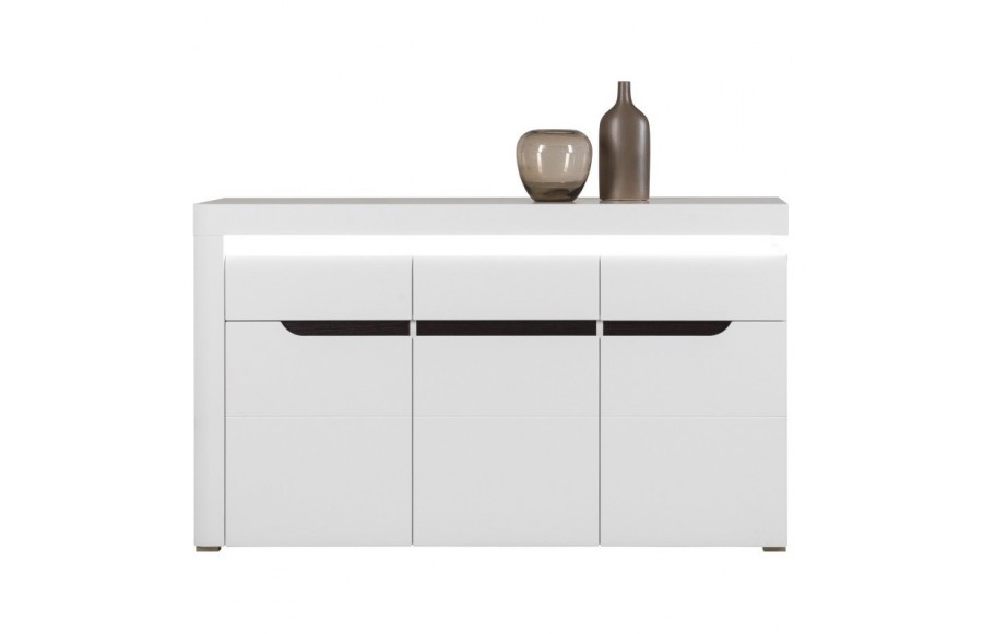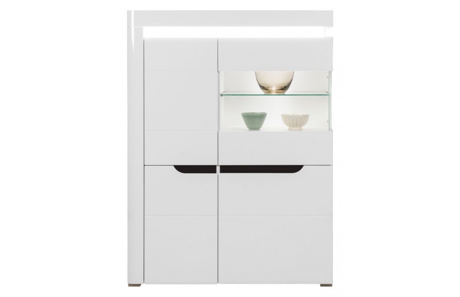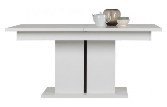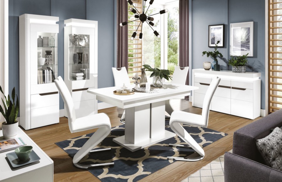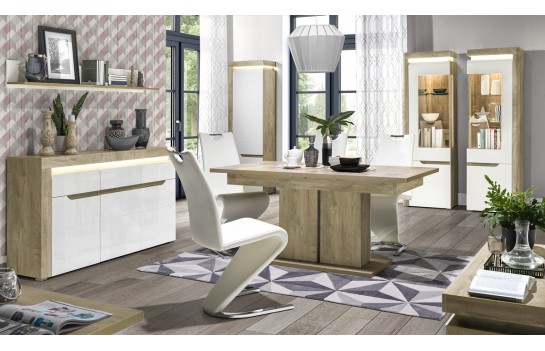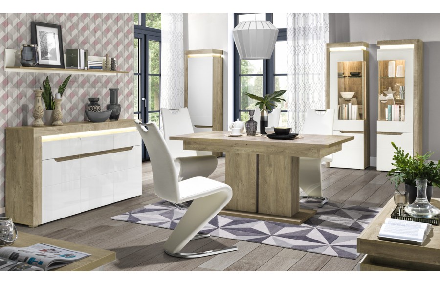 Jadalnia IRMA - to wyjątkowy system, który wciąga swoim nowoczesnym designem i niezrównaną funkcjonalnością. To połączenie ciepłego dębu i świeżej bieli tworzy efektowny kontrast, który od razu przyciąga wzrok. Niezaprzeczalnym atutem kolekcji IRMA jest innowacyjne oświetlenie LED. Każdy górny wieniec każdego elementu mebla jest podświetlony, dodając przestrzeni subtelny blask. Co więcej, szklane półki witryn także posiadają podświetlenie LED, co nadaje meblom wyjątkowego charakteru. Meble z kolekcji IRMA to nie tylko wyjątkowo estetyczny wybór, ale także solidne wykonanie. Dodatkowym plusem jest system cichego domyku drzwi, który działa w standardzie. W szufladach zaś zastosowano wysokiej jakości prowadnice kulowe z pełnym wysuwem, gwarantujące płynne i wygodne użytkowanie. Zestawienie mebli z kolekcji IRMA jest wszechstronne. Z 18 dostępnych elementów, możesz swobodnie urządzić salon, jadalnię, pokój młodzieżowy, a nawet sypialnię. W kolekcji znajdziesz piękny stół, który charakteryzuje się wyjątkową elastycznością. Dzięki dodatkowej wkładce stół rozkłada się do długości 200 cm, a wkładka jest dyskretnie schowana pod blatem. Dopasowując do niego witryny, komody, stoliki RTV i ławy, możesz stworzyć spójną i przytulną przestrzeń łączącą jadalnię z pokojem dziennym.