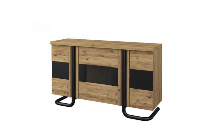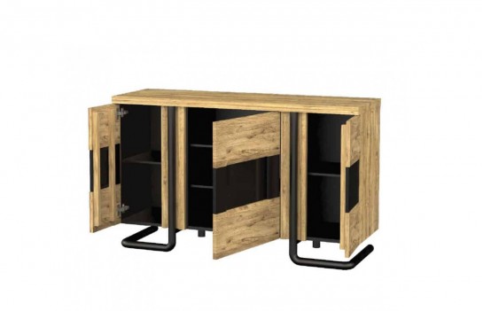 Komoda OMEGA 3D - to niezwykłe połączenie naturalnych materiałów takich jak drewno, skóra naturalna oraz metal. Fronty komody wykonane zostały z drewna dzikiego dębu z doskonale uwidocznionym usłojeniem. Dodatkowo zostały one wzbogacone czarnymi aplikacjami ze skóry naturalnej, które nadają bryle niepowtarzalnego charakteru oraz elegancji. Gięte, stalowe elementy doskonale podkreślają industrialny charakter kolekcji. Komoda OMEGA stanowi wyjątkowe uzupełnienie mebli w salonie, gabinecie lub jadalni, zapewniając dużą przestrzeń do przechowywania. Całość kolekcji cechuje minimalizm, funkcjonalność oraz wysoka jakość materiałów. W meblach OMEGA zastosowano nowoczesne rozwiązania - takie jak oświetlenie LED z włącznikiem bezdotykowym oraz system otwierania drzwi push to open.