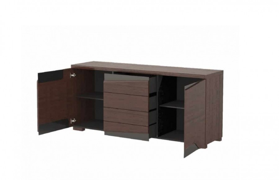 Komoda RIMINI 2D4SZ - to ekskluzywny mebel idealny do salonu lub gabinetu. Jej masywne kształty zostały urozmaicone przez delikatne, opływowe wcięcia, nadając meblom niepowtarzalny charakter. Cała kolekcja jest utrzymana w szlachetnej kolorystyce dębu burgundzkiego, co dodaje jej wyjątkowej elegancji. Czarne wstawki oraz subtelne oświetlenie nadają całości charakteru i podkreślają piękno naturalnych materiałów, takich jak drewno i okleina dębowa. Nowoczesna technologia, doskonały design oraz perfekcyjne wykonanie to cechy wyróżniające kolekcję RIMINI, która łączy w sobie tradycję z nowoczesnym wydźwiękiem. Kolekcja wyposażona jest w nowoczesne rozwiązania typu PUSH TO OPEN oraz pokryta jest przyjaznym dla środowiska i ludzi lakierem wodnym. To meble, które nie tylko zachwycają swoim wyglądem, ale także dbają o komfort i przyjazność dla środowiska.