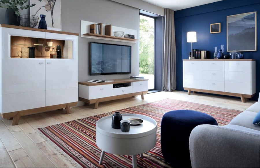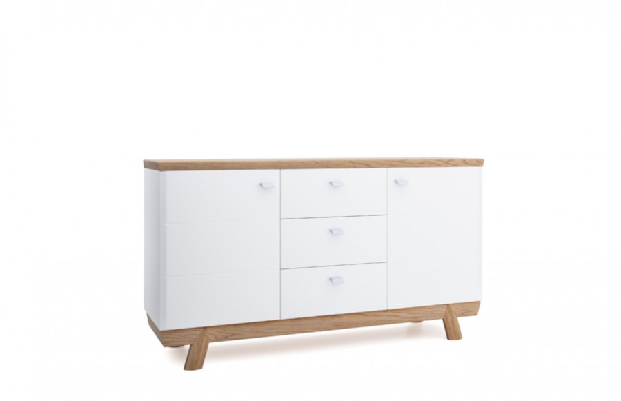 Komoda ASPEN - to niezwykła propozycja dla osób poszukujących elegancji i funkcjonalności w jednym. ASPEN to kolekcja gdzie nowoczesność spotyka elegancję poprzez harmonijne zestawienie drewna z białym połyskiem. Jej fronty, wyposażone w cichy domyk zapewniają płynne i bezgłośne zamykanie drzwiczek. W środkowej części komody znajdują się trzy wygodne szuflady z mechanizmem dociągu, co ułatwia ich otwieranie i zamykanie. Komoda ASPEN to nie tylko praktyczny mebel do przechowywania, ale także element dekoracyjny, który wzbogaci wystrój każdego pomieszczenia. Bogata oferta linii mebli ASPEN obejmuje różnorodne elementy, które możemy dostosować do naszych potrzeb. Dzięki dużej ilości brył, meble tej kolekcji zaaranżujemy do każdego wnętrza, zarówno jadalni, sypialni, czy też pokoju dziennego.