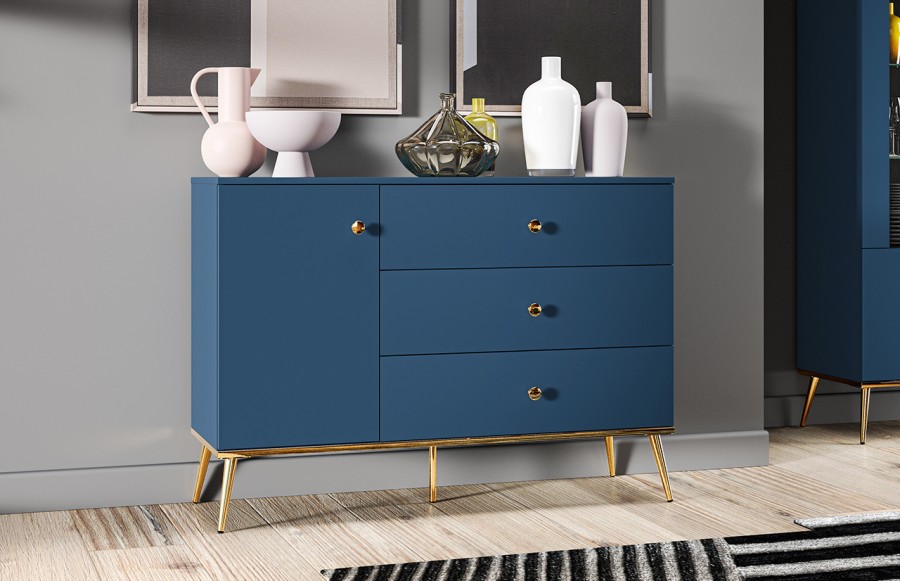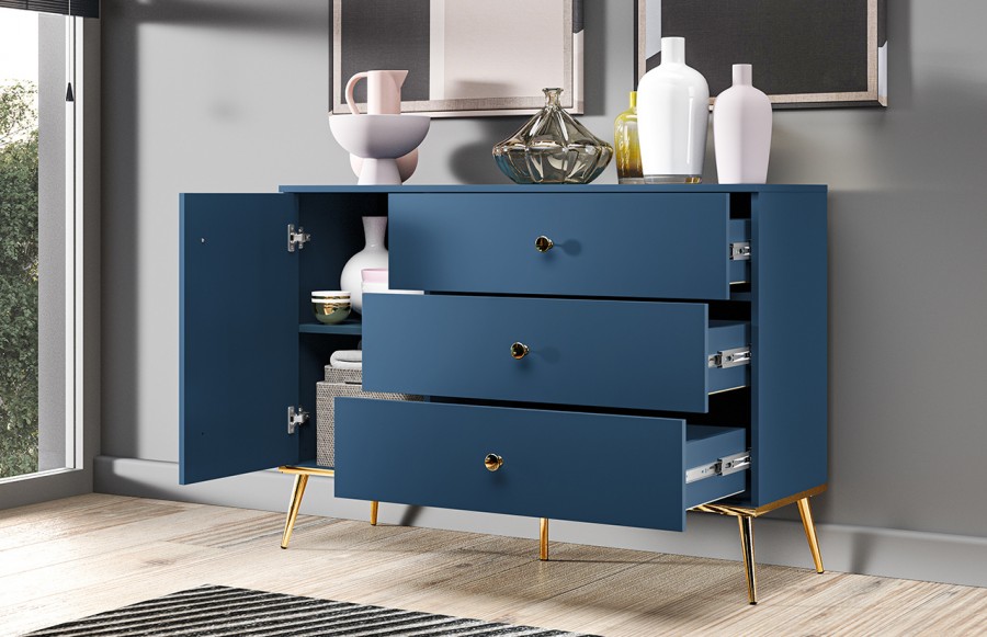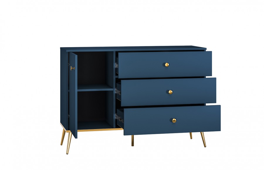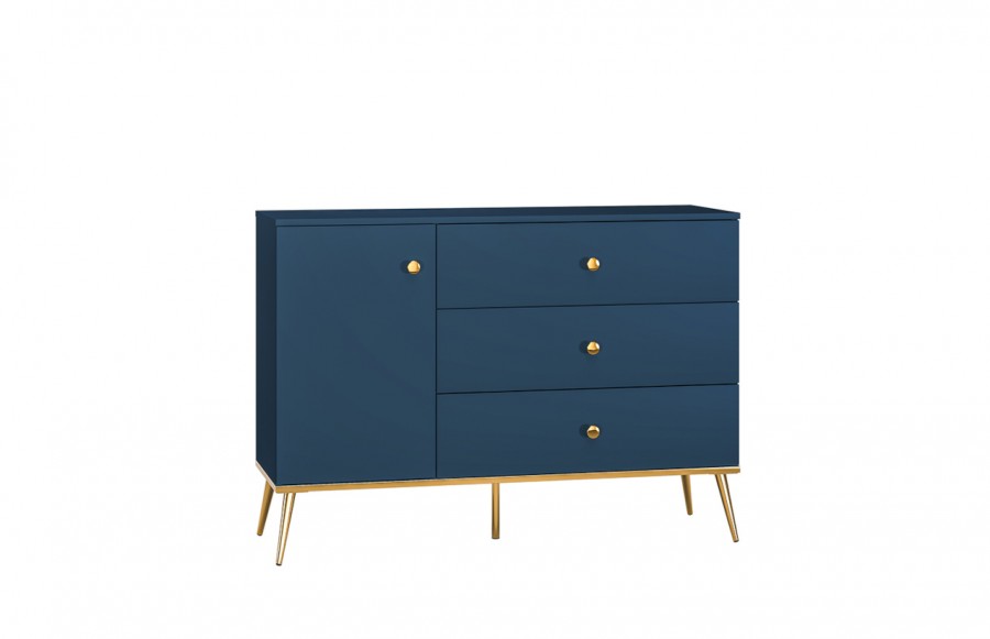 Komoda MARINE 04 -to idealny wybór dla miłośników elegancji i niebanalnego designu. Jej głęboki granatowy kolor nadaje wnętrzu harmonii, a złote uchwyty i nóżki dodają elegancji. To nie tylko praktyczny mebel do przechowywania, ale także element dekoracyjny, który nadaje charakteru Twojemu wnętrzu. Wykonana z wysokiej jakości materiałów, komoda jest trwała i estetyczna. Jej szerokie blaty pozwalają na eksponowanie dekoracji i innych przedmiotów. Komoda oferuje trzy szuflady oraz zamykaną szafkę z półką w środku. Komoda FOREST to połączenie funkcjonalności, elegancji i trwałości, które odmieni Twoje wnętrze.