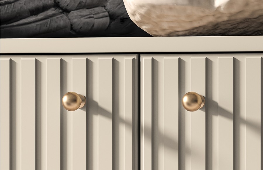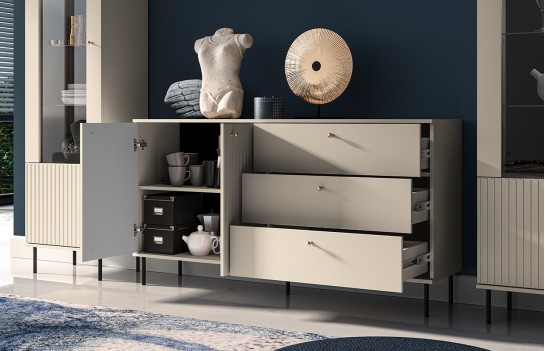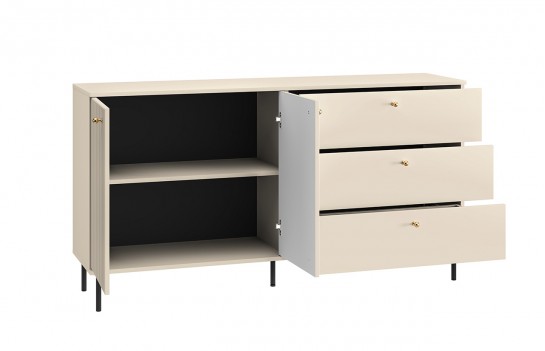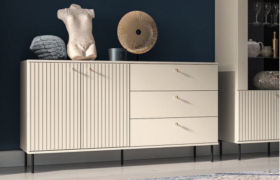 Komoda SOPHIE 04 - to elegancka komoda, która zachwyca wyjątkowym połączeniem lameli, gładkich frontów na szufladach oraz złotymi i czarnymi detalami. Ta kremowa komoda nie tylko zapewni mnóstwo miejsca do przechowywania, ale także umożliwi eksponowanie wielu dekoracji. Wykonana z wysokiej jakości materiałów, komoda jest trwała i estetyczna. Komoda oferuje trzy szuflady oraz zamykaną szafkę z półką w środku. Komoda SOPHIE to harmonijne połączenie stylu glamour i nowoczesności, idealnie pasujące do różnych aranżacji salonowych. Najlepiej prezentuje się w towarzystwie innych mebli z kolekcji SOPHIE.