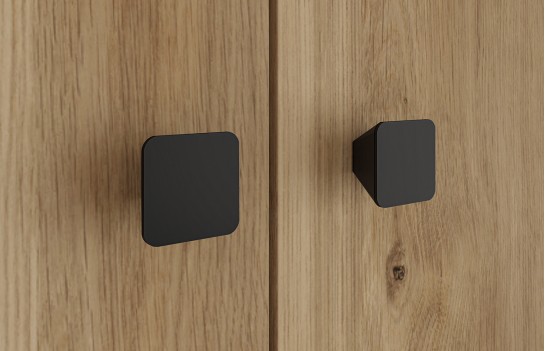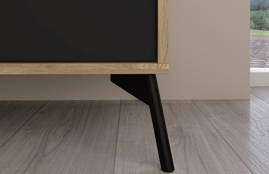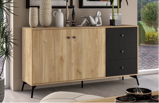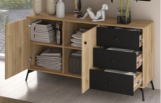Komoda AGIS 04 - to doskonałe połączenie szafek i szuflad. Lewa strona w eleganckim odcieniu dębu zawiera dwie pojemne szafki z półkami, natomiast prawa strona ma trzy funkcjonalne szuflady z czarnymi frontami. Obszerny blat umożliwia dowolne wykorzystanie powierzchni. Kontrastujące kolory sprawiają, że mebel doskonale komponuje się zarówno z jasnymi, jak i ciemnymi wnętrzami. Elementy ruchome komody cechuje wyjątkowa funkcjonalność, dzięki prowadnicom szuflad z pełnym wysuwem i cichym domykiem. Komoda AGIS to połączenie funkcjonalności, elegancji i trwałości, które odmieni Twoje wnętrze.