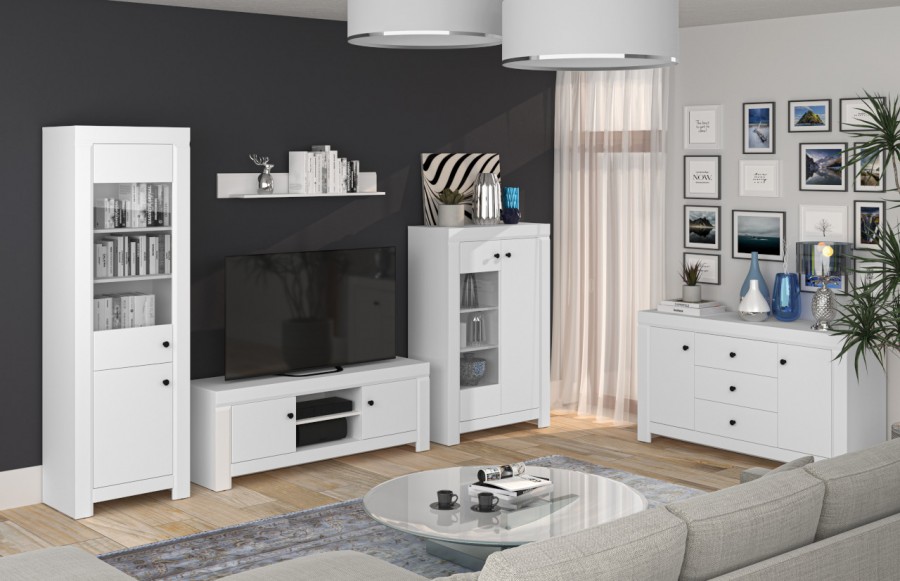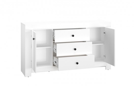 Komoda LAHTI 09 - to idealny wybór do aranżacji salonu, pokoju młodzieżowego lub sypialni. Jej matowe, białe wykończenie z elegancką frezowaną listwą nadaje meblom nowoczesny wygląd. Fronty komody wykonane są z wysokiej jakości płyty MDF, co gwarantuje trwałość i stylowy wygląd. Czarne, metalowe uchwyty dodają meblom charakteru, a pełne wysuwane szuflady i drzwi szafek z cichym domykiem zapewniają wygodę codziennego użytkowania. LAHTI to meble, które doskonale wpasują się w nowoczesne wnętrza i zadowolą nawet najbardziej wymagających klientów.