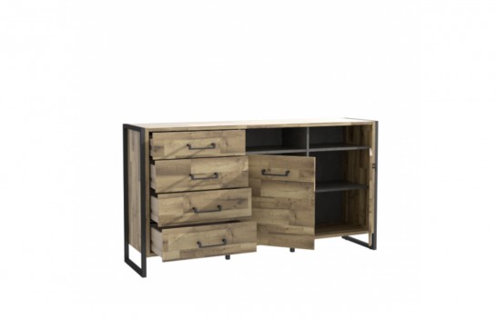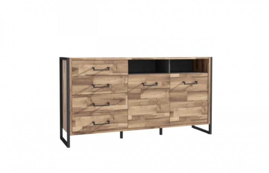 Komoda HUD - to nowoczesny mebel do salonu lub jadalni, łączący dekor Beton Ciemnoszary i Dąb Klepkowy z czarnymi metalowymi uchwytami, nadającymi mu wyjątkowy charakter. Oferuje dużo miejsca do przechowywania z czterema szufladami, dwiema szafkami i dwiema otwartymi półkami, które można podświetlić oświetleniem LED. Szeroki blat komody doskonale nadaje się do wyeksponowania dekoracji. Mebel jest łatwy do utrzymania w czystości i trwały. W zestawie znajdują się elementy do montażu ściennego, a mebel wykonany jest z wysokiej jakości płyty wiórowej. Ta komoda doskonale wkomponuje się w każdy salon, dodając mu stylu i funkcjonalności.