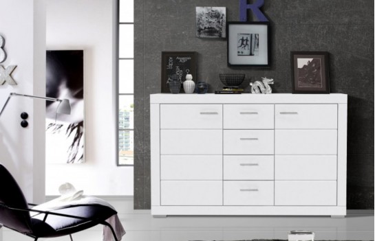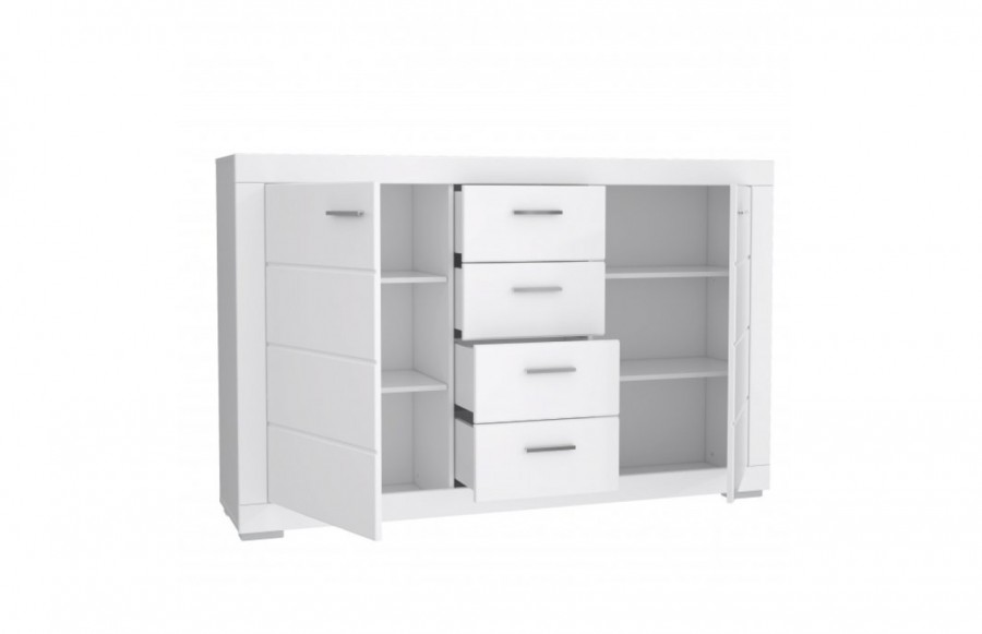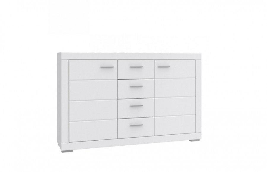 Komoda SNOW - to minimalistyczny mebel, który doskonale pasuje do różnych wnętrz. Prosta forma, matowe wykończenie w kolorze białym, oraz ozdobne frezowania na froncie nadają jej elegancki wygląd. Komoda ma cztery szuflady i dwie półki, co ułatwia przechowywanie i organizację przedmiotów. Może być używana w salonie, sypialni lub pokoju młodzieżowym. Jej matowe wykończenie zapobiega odciskom palców i ułatwia utrzymanie czystości. Metalowe uchwyty w kolorze chromu i system cichego domykania dodają komfortu użytkowania. Geometria mebla z pogrubionymi bokami i chromowanymi nóżkami nadaje mu wyjątkowy charakter i oryginalny klimat. Komoda SNOW to połączenie funkcjonalności, elegancji i trwałości, które odmieni Twoje wnętrze.