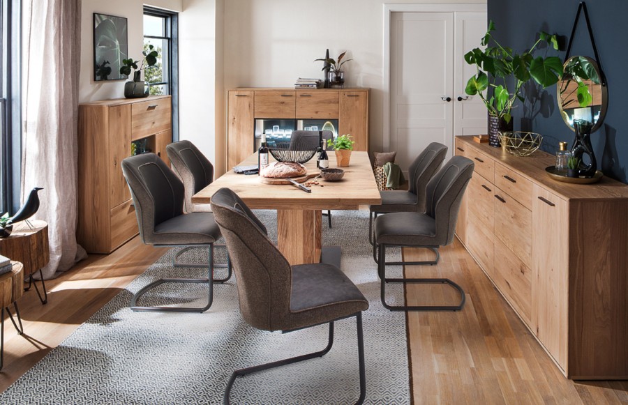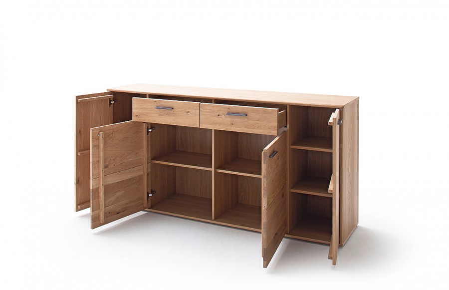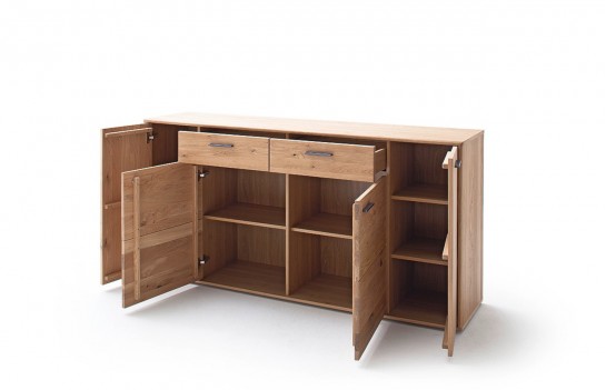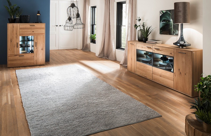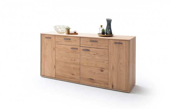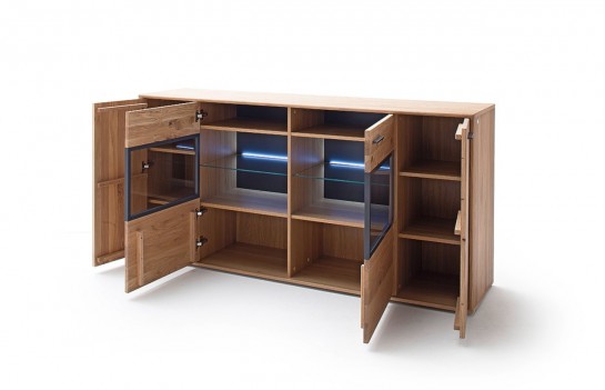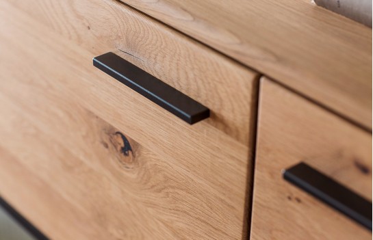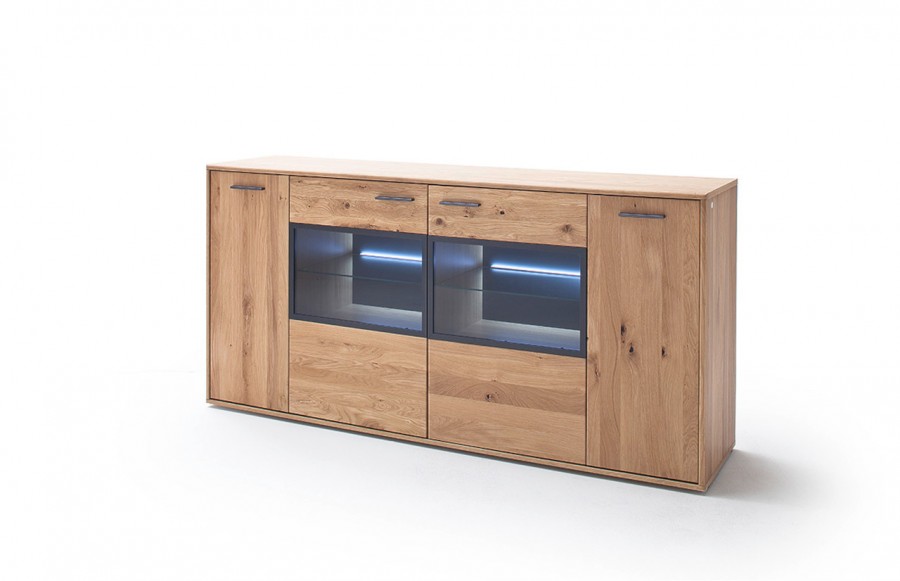 Komoda PORTLAND - wysokiej jakości komoda wykonana z litego drewna dębowego i okleiny naturalnej dębowej. Występuje w dwóch wariantach - z przeszkleniem na froncie oraz bez. Fronty komody wykonane są z litego drewna dębowego, to dąb sękaty olejowany w kolorze bianco. Korpus to okleina naturalna. Ramki szyb i uchwyty wykonane są z metalu w kolorze lakier antracyt mat. Możliwe przeszklenie w komodzie to szkło Parsol szare. Wszystkie szuflady i drzwi komody Portland wyposażone są w cichy domyk. Istnieje możliwość dokupienia oświetlenia LED sterowanego dotykowo lub pilotem.