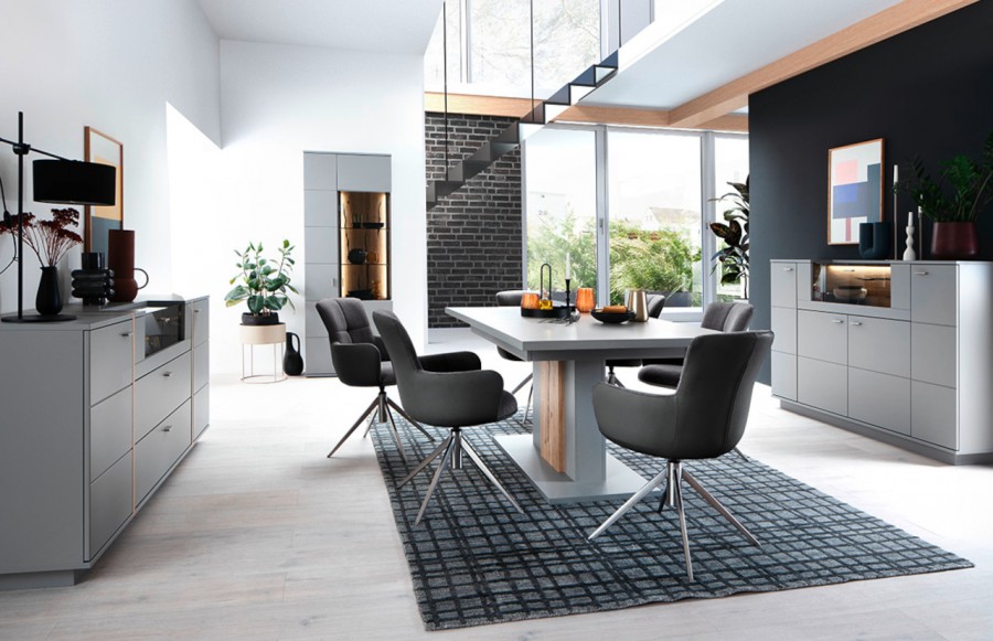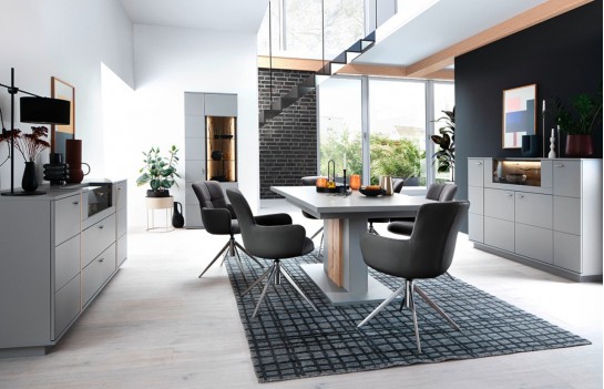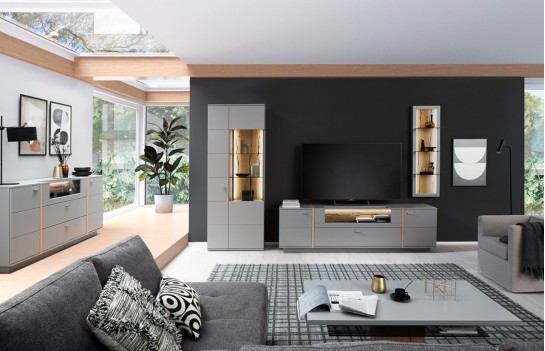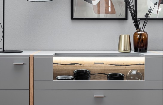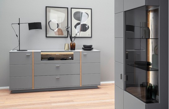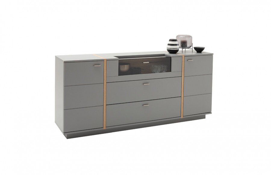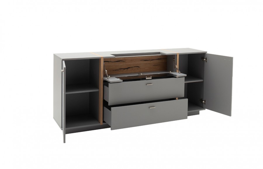 Komoda SEVILLA - elegancka komoda w kolorze szarym. Idealna do solanu lub sypialni. Istnieje możliwość dokupienia innych elementów kolekcji. Komoda jest solidnie wykonana, gdyż fronty to MDF, lakier antyczny szary mat, a korpus to płyta laminowana, krawędzie ABS. Aplikacje dekoracyjne komody wykonano z okleiny naturalnej dębowej. Wszystkie szuflady i drzwi wyposażone są w cichy domyk, uchwyty wykonane są z metalu. Istnieje możliwość dokupienia opcjonalnie oświetlenia LED sterowanego dotykowo lub pilotem.