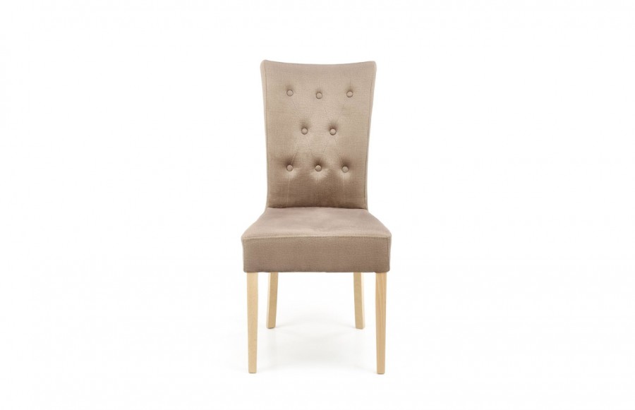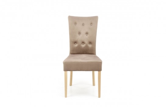 Krzesło VERMONT - to mebel pełen uroku i elegancji. Jego siedzisko i oparcie zostały pięknie obszyte aksamitną tkaniną, nadając mu zarówno elegancki wygląd, jak i miękkość w dotyku. Oparcie krzesła ozdobione jest efektownymi pikowaniami z guzikami, co nadaje mu niepowtarzalny charakter. Solidne nogi krzesła, wykonane z litego drewna bukowego w odcieniu dąb miodowy, nie tylko zapewniają stabilność i trwałość, ale także dodają naturalnego uroku i ciepła całej kompozycji. Doskonale komponuje się zarówno z aranżacjami klasycznymi, jak i nowoczesnymi, tworząc przyjemną atmosferę i dodając odrobinę luksusu.