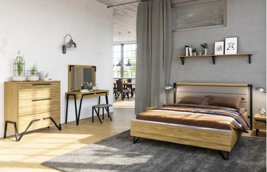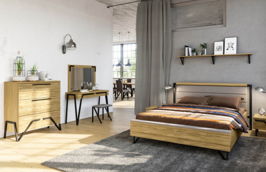 Łóżko PIK - wyjątkowe łóżko w stylu industrialnym. Wykonane jest z litego drewna dębowego oraz naturalnej okleiny dębowej. Metalowe nogi łóżka podkreślają jego loftowy charakter. Połączenie drewna z tkaniną obiciową podkreśla jego urok i wyjątkowość. Całość sprawia, że konstrukcja mebla prezentuje się niezwykle elegancko. Istnieje możliwość zamówienia wersji łóżka z pojemnikiem na pościel.