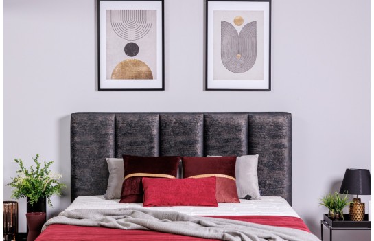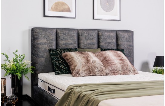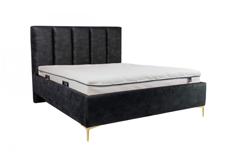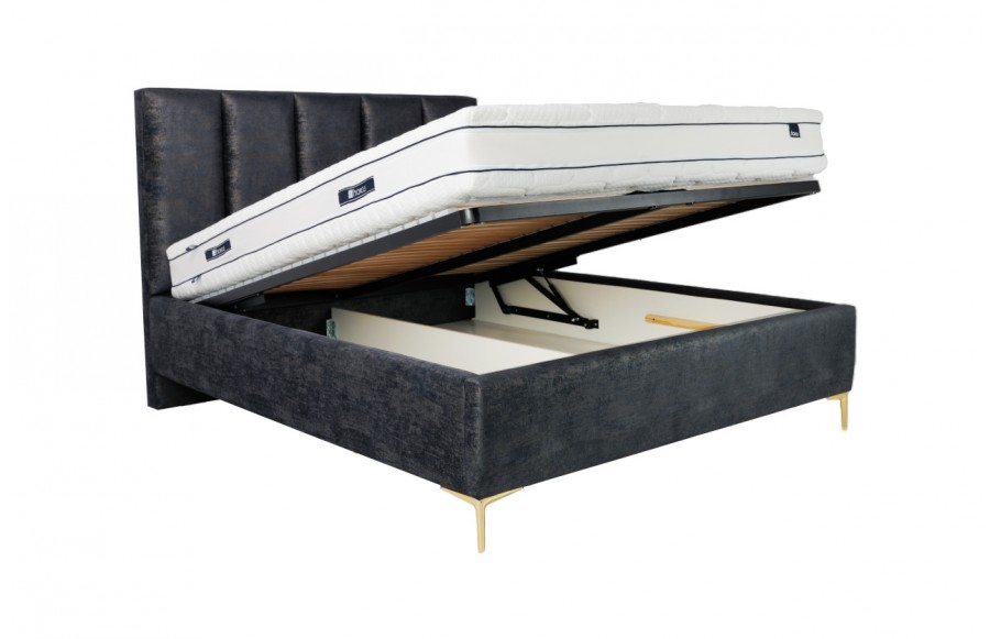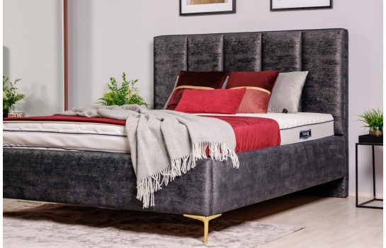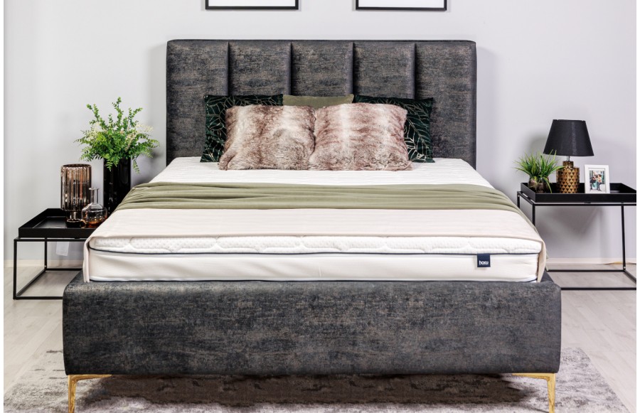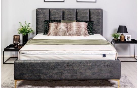 Łóżko GAJA - tapicerowane łóżko na nóżkach z pojemnikiem na pościel. Mebel ten idealnie wpisuje się niemal we wszystkie wnętrza o różnych stylach. Atutem łóżka jest możliwości wyboru tkaniny z bogatego wzornika tkanin. Dzięki temu możemy dopasować jego wygląd do aranżacji sypialni. Charakterystycznymi elementami łóżka Gaja jest pikowane wezgłowie i wysokie nóżki, nadające mu lekkości. Całość sprawia, że mebel prezentuje się nowocześnie, a zarazem bardzo elegancko. Możemy zamówić łóżko z ramą dookoła materaca i wybrać jej grubość - 6 lub 9 cm. Jeżeli wariant posiada pojemnik na pościel to w cenę łóżka wliczony jest stelaż unoszony za pomocą siłowników gazowych. W przypadku łóżka bez pojemnika, stelaż należy dokupić osobno. Dodatkowo, istnieje możliwość wyboru koloru nóżki: złoty błyszczący, satyna, czarny mat i czarny chrom.