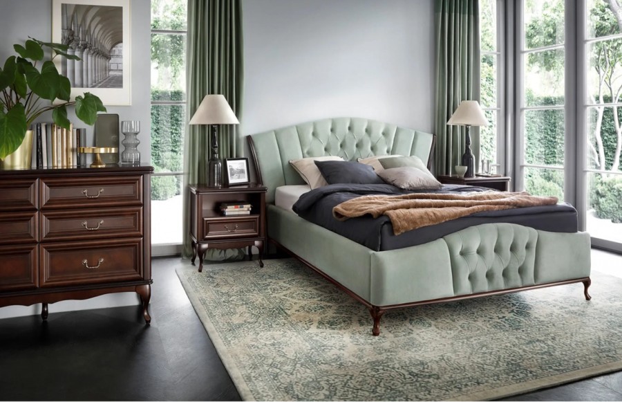 Łóżko WERSAL N - to niezwykły element kolekcji WERSAL, który przeniesie Cię w świat klasyki i wyjątkowej formy. Delikatnie gięte fronty oraz mosiężne uchwyty tworzą atmosferę pełną elegancji i luksusu. Te klasyczne meble o perfekcyjnym wykończeniu wprowadzą do Twojego wnętrza błogą harmonię. Piękno kolekcji WERSAL podkreśla wyjątkowy wybór materiałów najwyższej jakości. Elementy drewniane wykonane z olchy zapewniają trwałość i elegancję, a czereśniowa naturalna okleina otacza meble, podkreślając ich wyjątkowy charakter. Wybierając spośród odcieni tofii, venge, białego, białego patyny czy kremu, dostosujesz sypialnię WERSAL do swoich preferencji. Łóżko oferowane jest w dwóch wymiarach: 160 i 180 cm. Sypialnia WERSAL oferuje cztery różne rodzaje łóżek oraz szafy w różnych rozmiarach, komody, toaletki, lustra, szafki nocne, ławeczki i taborety. To wszechstronna kolekcja, która pozwoli Ci stworzyć swój własny, królewski zakątek w Twoim domu.