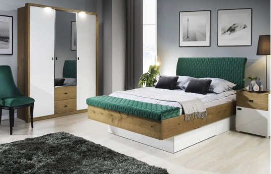 Łóżko RIO 1B - solidne i nowoczesne łóżko z tapicerowanym zagłówkiem. Charakteryzuje się wysoką jakością i klasyczną stylistyką. Prosta rama łóżka połączona z tapicerowanym wezgłowiem sprawia, że konstrukcja mebla prezentuje się elegancko i ekskluzywnie. Dodatkowym atutem jest możliwość wybrania tkaniny spośród wielu kolorów. Dzięki temu możemy dopasować wygląd mebla do preferencji i oczekiwań klienta. Łóżko RIO to połączenie ciepłego naturalnego dębu z czystą bielą, które doskonale wpisze się w każde wnętrze. Łózko dodatkowo wyposażone jest w szuflady z obu stron łóżka w standardzie.