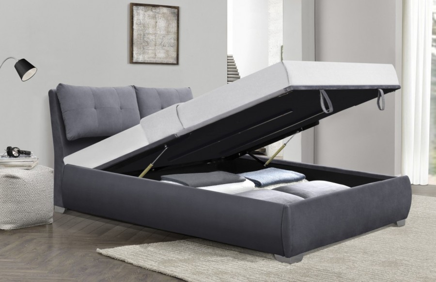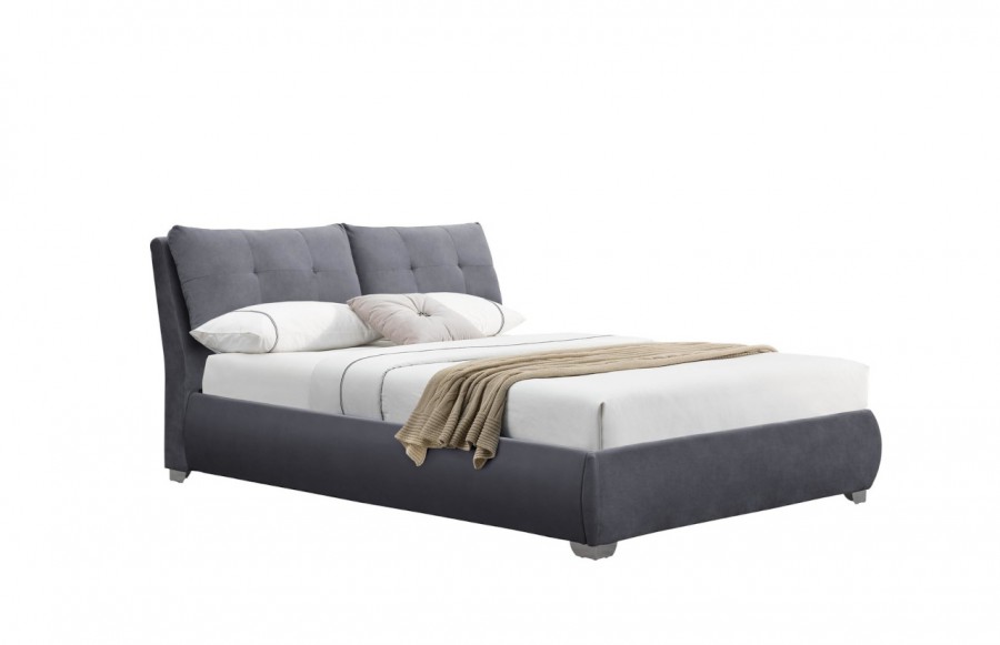 Łóżko BRIDGET - to dwuosobowe łóżko w eleganckiej tkaninie popielatej doskonale pasuje do sypialni w stylu skandynawskim i nowoczesnym. Wysokie zagłówki z pikowanymi poduszkami są zarówno efektowne, jak i funkcjonalne. Łóżko posiada praktyczny schowek na pościel. Stabilne nóżki ze stali chromowanej zapewniają trwałość. To doskonałe rozwiązanie łączące komfort i estetykę w jednym meblu.