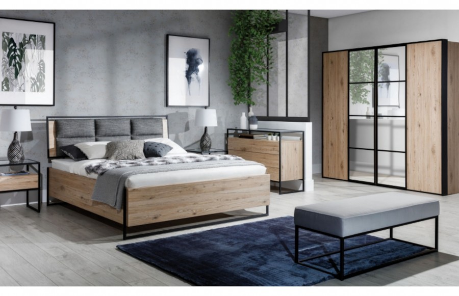 Łóżko GLASS LOFT - to stylowy i nowoczesny mebel sypialniany. Idealnie pasuje do loftowego lub industrialnego wystroju sypialni. Głównym elementem łóżka jest solidny stelaż z imitacją drewna dębowego, przeznaczony dla materaca o wymiarach 160x200 cm. Surowy charakter mebla podkreślają metalowe wstawki w kolorze czarnym, szczególnie widoczne w nóżkach i na zagłówku. Wezgłowie pokryto dekoracyjną szarą tkaniną z pikowaniami. Dostępna opcja wyposażenia łóżka w pojemnik na pościel. GLASS LOFT to eleganckie i funkcjonalne rozwiązanie do nowoczesnej sypialni.