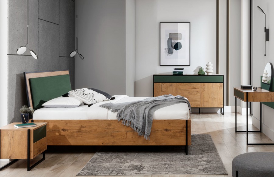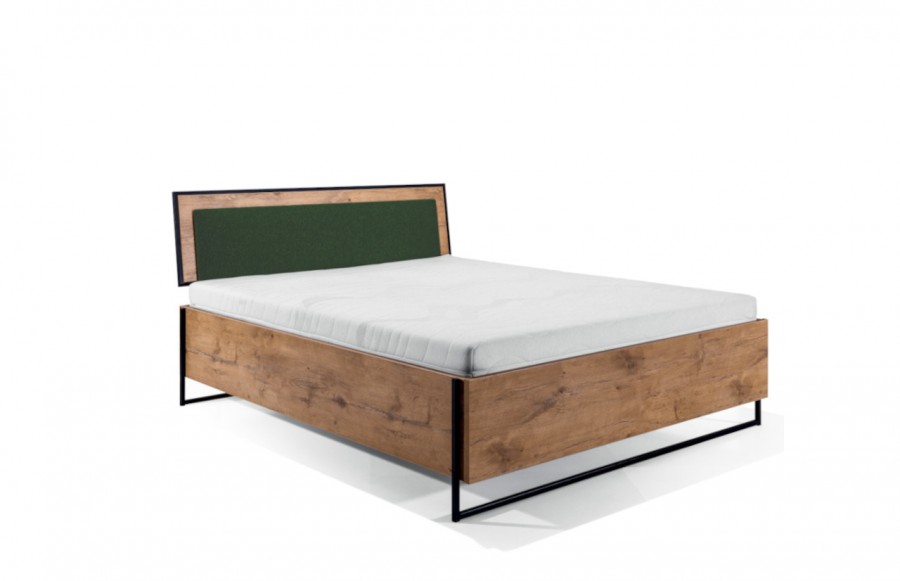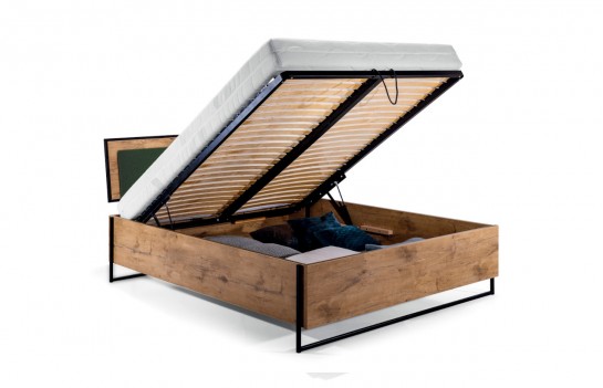 Łóżko LOFT COLOR - to doskonałe miejsce do relaksu w Twojej sypialni. Jego nowoczesny wygląd doskonale harmonizuje z wystrojem w stylu industrialnym, nadając pomieszczeniu surowy i wyjątkowy charakter. To solidne łóżko wykonane z trwałej płyty meblowej imitującej surowe drewno dębowe o kolorze dąb Lancelot. Wyposażono je w minimalistyczny zagłówek tapicerowany zieloną tkaniną oraz metalowe nóżki, które dodają mu wyjątkowego charakteru. Łóżko dostępne w wersji z pojemnikiem lub w wersji bez schowka. Dostęp do pojemnika na pościel ułatwiają wydajne podnośniki gazowe. Dzięki niemu Twoja sypialnia zyska nowoczesny, surowy wygląd, który przypadnie do gustu miłośnikom stylu industrialnego.