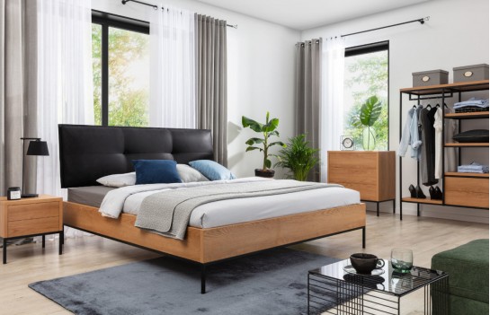 Łóżko LOFT KARMEL - to nowoczesna i minimalistyczna kolekcja dla wielbicieli prostoty, doskonale pasująca do wnętrz w stylu loft. Wykonana z wysokogatunkowej płyty meblowej dąb karmel, uzupełniona czarnymi metalowymi nóżkami. Wezgłowie tapicerowane wysokiej jakości tkaniną nadaje łóżku ciepły i naturalny wygląd, co dodaje wnętrzu elegancji i przytulności. Czarne wezgłowie doskonale komponuje się z loftowym stylem, jednocześnie zapewniając wygodne podparcie dla pleców. Dostępne są dwie wersje: z praktycznym pojemnikiem na pościel lub bez schowka. Łatwy dostęp do pojemnika na pościel zapewniają wydajne podnośniki gazowe. To meble dla osób, które cenią sobie nowoczesny design oraz funkcjonalność.