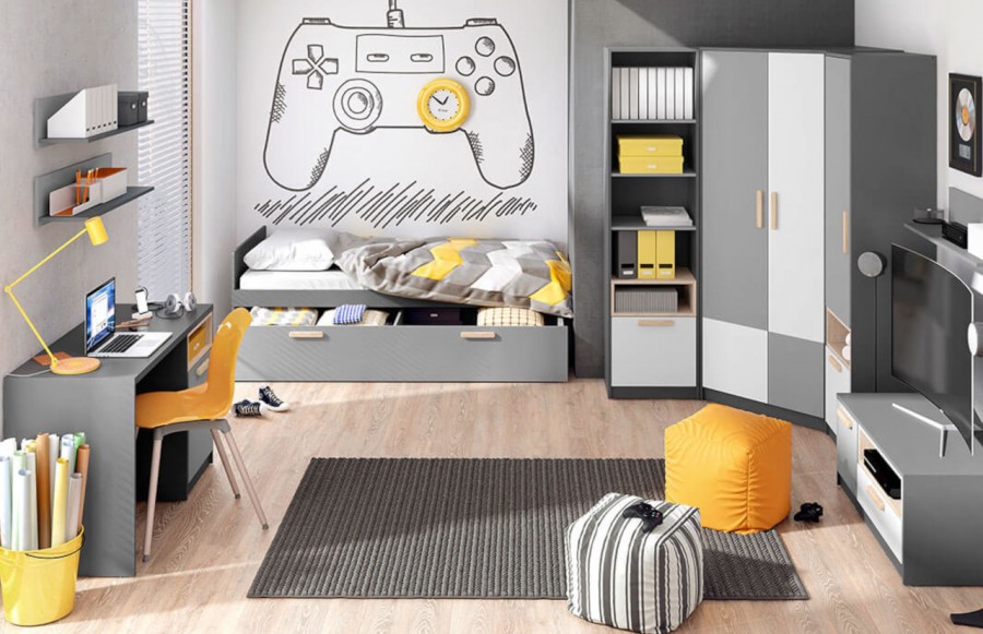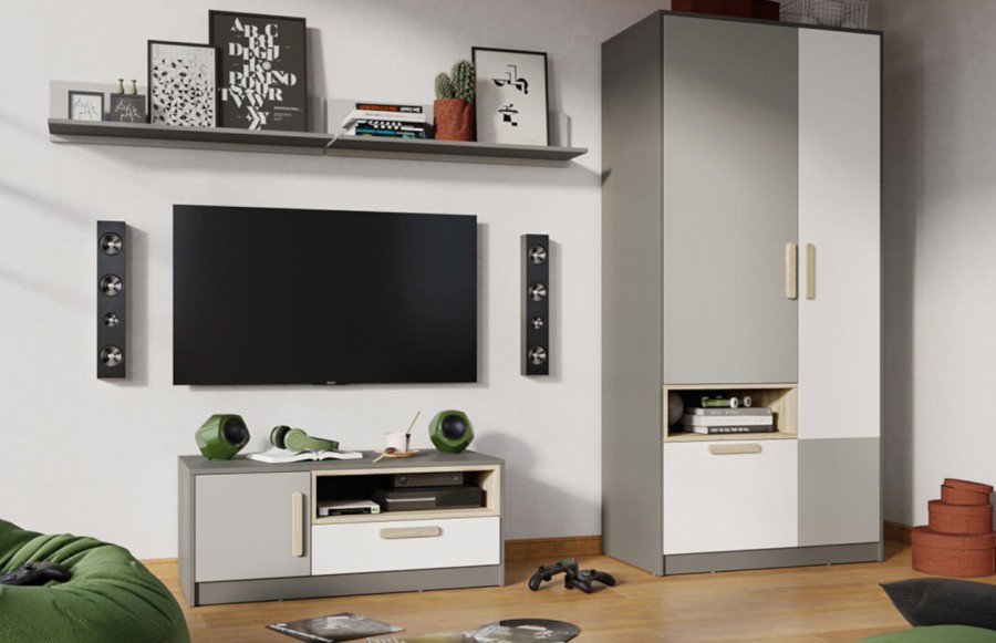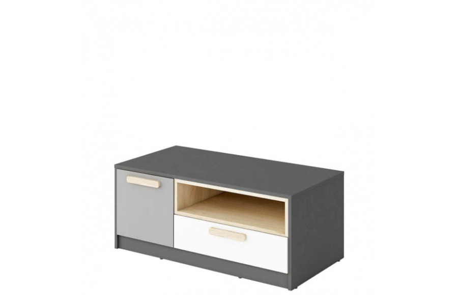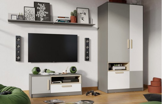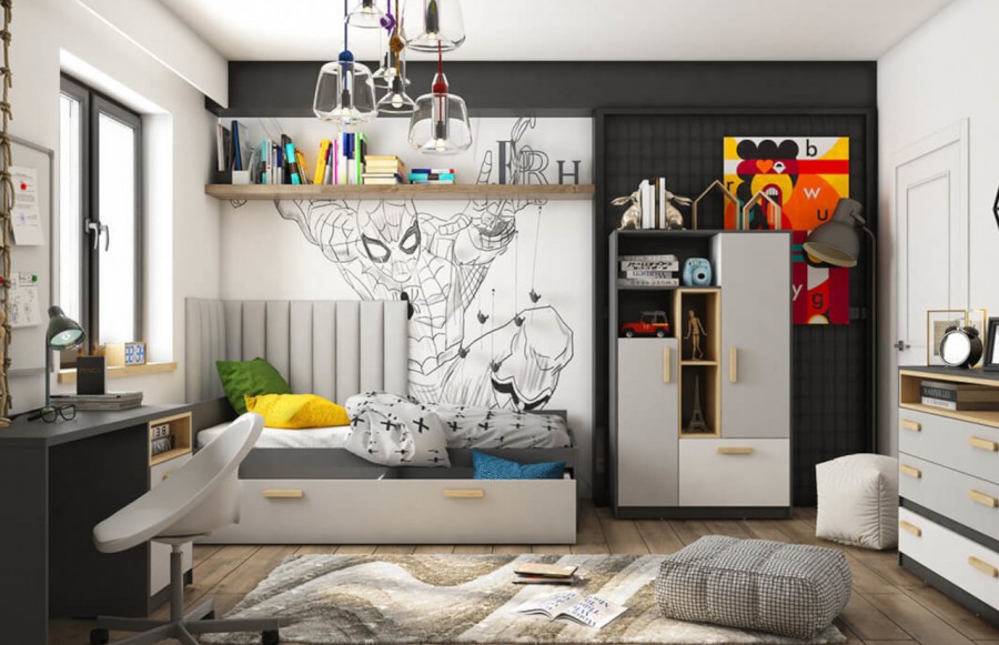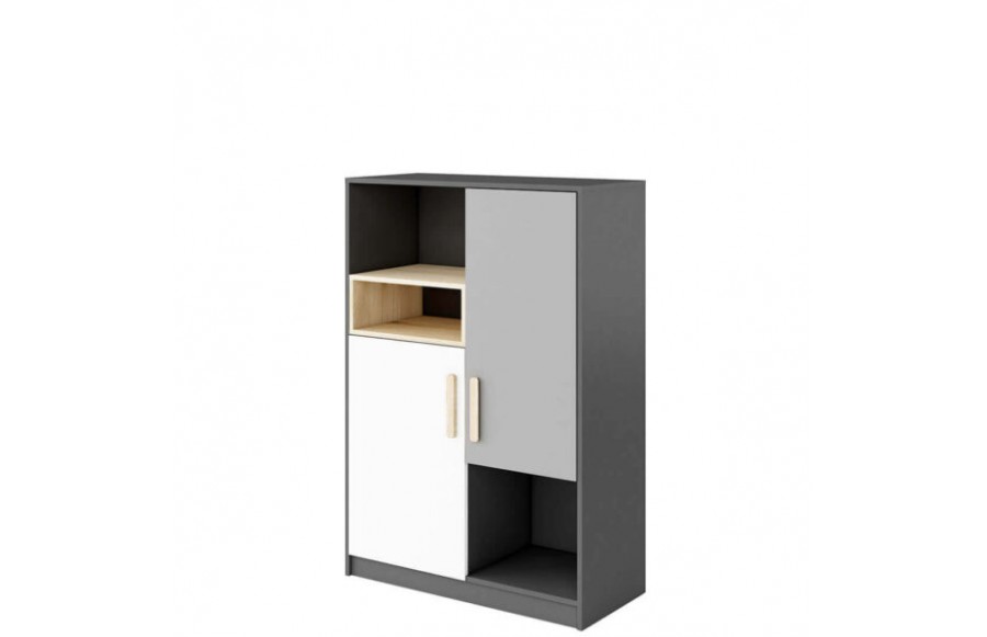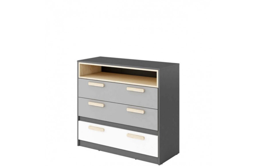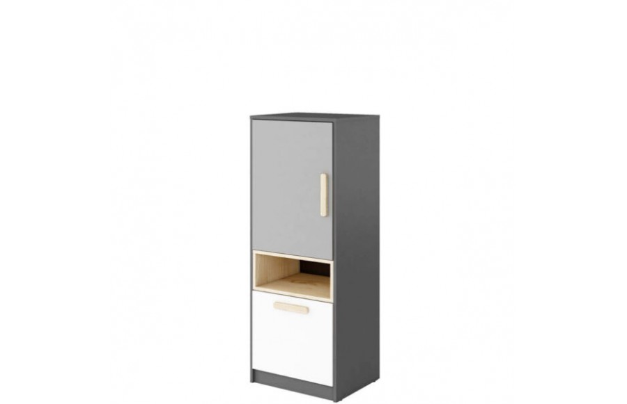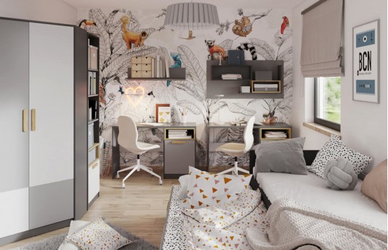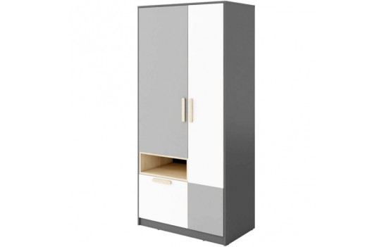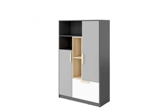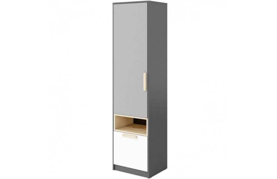 Kolekcja POK - to połączenie modnych barw i geometrycznych kształtów, które sprawią, że wnętrze będzie promieniować pozytywną energią. Kolekcja mebli POK to idealne zestawienie prostych form i dopasowanej kolorystyki, doskonale odpowiadające na zmieniające się potrzeby dziecka. Niebanalne połączenie grafitu, bieli i szarości z imitacją Buku Ibsen to aktualny trend w meblarstwie, zapewniający nie tylko styl, ale także trwałość. Meble wykonane są z wysokiej jakości laminowanej płyty meblowej, gwarantującej odporność na uszkodzenia mechaniczne. System różnych wielkości szaf i regałów pozwoli na kreatywne łączenie, idealnie dopasowując meble do indywidualnych potrzeb i stylu wnętrza. W kolekcji znajdziesz aż pięć rodzajów szaf, w tym szafę-garderobę z oświetleniem, idealną dla rodzeństwa lub osób posiadających dużą ilość rzeczy. Pojemne szuflady to doskonałe miejsce do przechowywania bielizny, dodatków, dokumentów i innych przedmiotów, pomagając utrzymać porządek w pokoju. Komfortowa strefa nauki to klucz do sukcesów w szkole. Biurko POK z optymalnym blatem, szafką i praktyczną wnęką zapewni odpowiednie warunki do nauki i pracy. Uniwersalna kolorystyka, funkcjonalne bryły i modny design sprawiają, że meble te pasują do różnych stylów aranżacyjnych, niezależnie od wieku dziecka, stanowiąc solidną bazę do tworzenia idealnego otoczenia. Wykonane z dbałością o detale, meble dziecięce POK zapewniają nie tylko komfort, ale także trwałość. Każdy element kolekcji wyróżnia się nowoczesnym designem, doskonałym wykończeniem i wysoką jakością wykonania, co gwarantuje ich estetykę i solidność przez lata użytkowania.