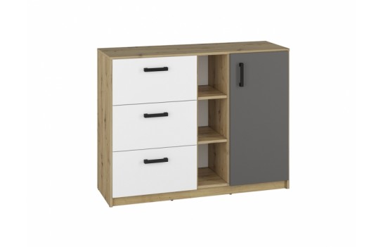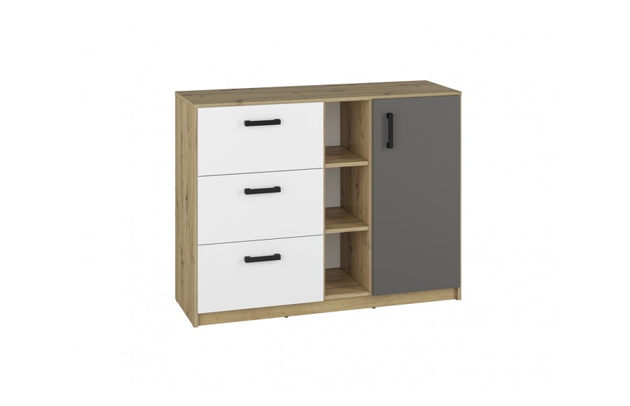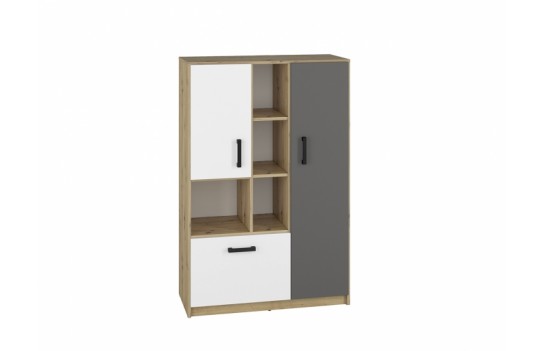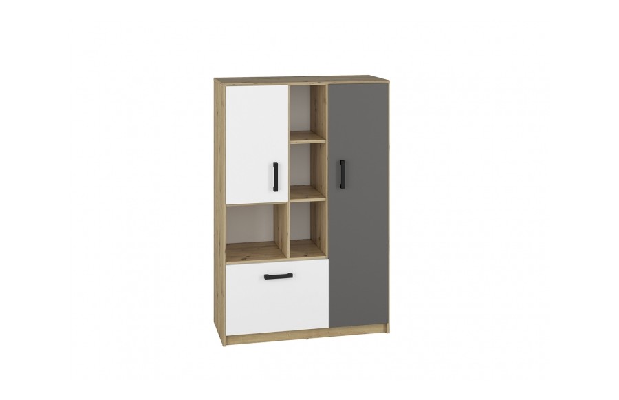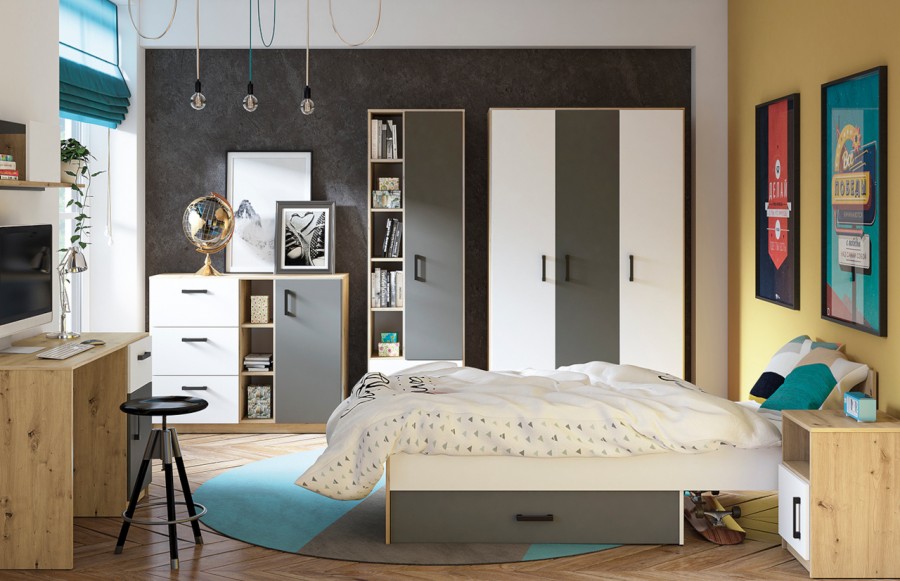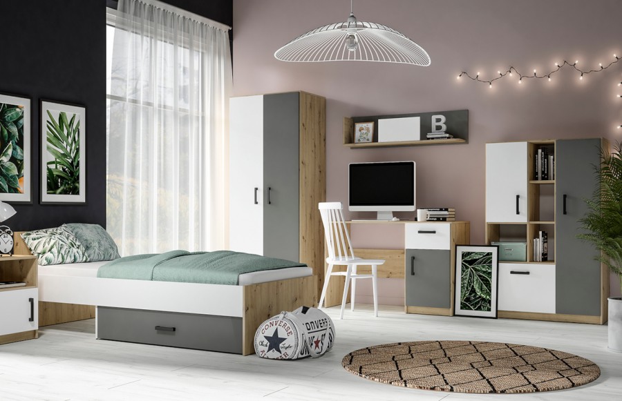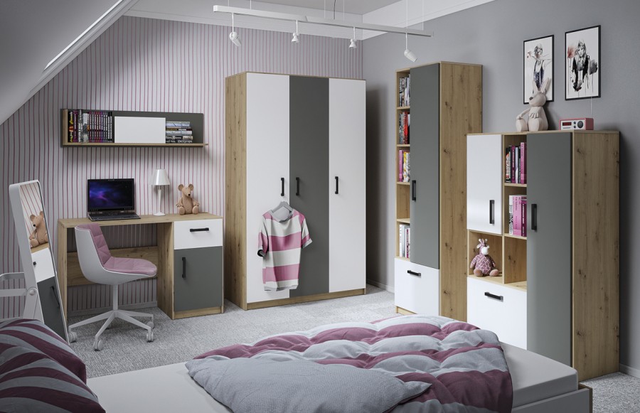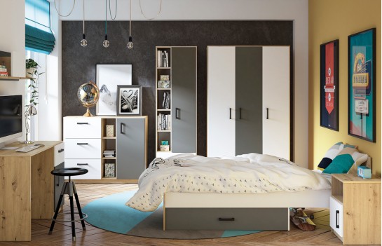 Kolekcja FINI - to nowoczesna interpretacja mebli dla młodzieży, łącząca prostotę formy z oryginalnymi dekorami. Dynamiczna kombinacja kolorów - białego alpejskiego i antracytowego z klasycznym dębem artisan - odzwierciedla temperament i energię nastolatków. Geometria frontów i korpusów wprowadza porządek, spójność i młodzieżową elegancję, podkreślając nieprzeciętność kolekcji. Kolekcja mebli FINI to idealne rozwiązanie zarówno do pokoju dziecięcego, jak i młodzieżowego, doskonale adaptując się do zmieniających się potrzeb dziecka. Meble zostały wykonane z wysokiej jakości laminowanej płyty meblowej, zapewniającej trwałość i odporność na uszkodzenia mechaniczne. Dzięki różnorodnym wielkościom szaf i regałów, kolekcja FINI pozwala na elastyczne i kreatywne łączenie, idealnie dopasowując meble do indywidualnych potrzeb i stylu wnętrza. Trzy rodzaje szaf, w tym narożna szafa-garderoba, zapewniają mnóstwo miejsca na przechowywanie rzeczy, doskonale wspierając utrzymanie porządku w pokoju. Starannie przemyślana strefa przechowywania to klucz do organizacji codziennego życia. Otwarte półki umożliwiają wyeksponowanie ulubionych przedmiotów, podczas gdy pojemne szuflady pomieszczą wszystko, czego potrzebujesz. Meble dziecięce FINI zostały zaprojektowane tak, aby rosnąć wraz z Twoim dzieckiem, zapewniając nie tylko komfort, ale także funkcjonalność. Ich uniwersalny design i wysoka jakość wykonania sprawiają, że są solidną bazą do tworzenia różnorodnych aranżacji, które będą cieszyć oko przez wiele lat.