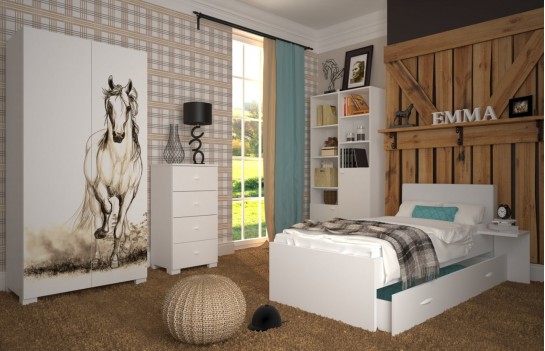 Kolekcja HORSE WHITE - to połączenie elegancji i solidności, które doskonale sprawdzi się w każdym dziecięcym wnętrzu, od narodzin aż po dorosłość. Wyjątkowe fronty mebli z grawerowanymi, matowymi końmi oraz korpusy utrzymane w białym kolorze tworzą unikalny design, który spełni marzenia każdego dziecka. Różnorodność brył i wysoka funkcjonalność zapewniają wygodę zarówno niemowlakom, przedszkolakom, uczniom, jak i studentom, adaptując się do ich zmieniających się potrzeb. Meble z kolekcji HORSE WHITE nie tylko podążają za najnowszymi trendami pod względem kolorystyki i designu, ale także spełniają najwyższe standardy jakościowe i bezpieczeństwa. Posiadają certyfikat TUV oraz spełniają surowe normy polskie i europejskie, co gwarantuje bezpieczeństwo Twojego dziecka. Solidna konstrukcja oraz wysokiej jakości podzespoły pozwalają zaoferować 5-letnią gwarancję na produkty z tek kolekcji. Dla lepszej użyteczności i funkcjonalności, meble te oferują szereg udogodnień takich jak, system otwierania drzwi push-to-open oraz zawiasy BLUM z funkcją cichego domykania. Fronty malowane są ekologicznymi farbami wodnymi BECKERS i utwardzone promieniowaniem UV, co zwiększa ich odporność na uszkodzenia. Korpusy mebli wykonane z laminowanej płyty o grubości 18 mm, co zapewnia wyjątkową odporność na zarysowania. Kolekcja HORSE WHITE dedykowana jest dzieciom i młodzieży, którzy cenią sobie klasyczny, stonowany design oraz oczekują funkcjonalności i elegancji. Dzięki solidnemu wykonaniu i wysokiej jakości materiałom, meble te będą służyć przez wiele lat, tworząc wygodne, funkcjonalne i estetyczne otoczenie sprzyjające rozwojowi i samodzielności dzieci.