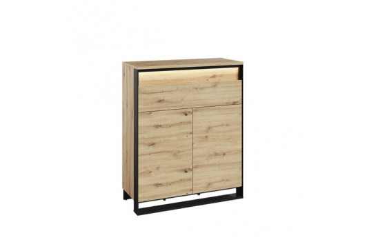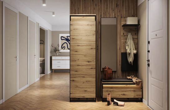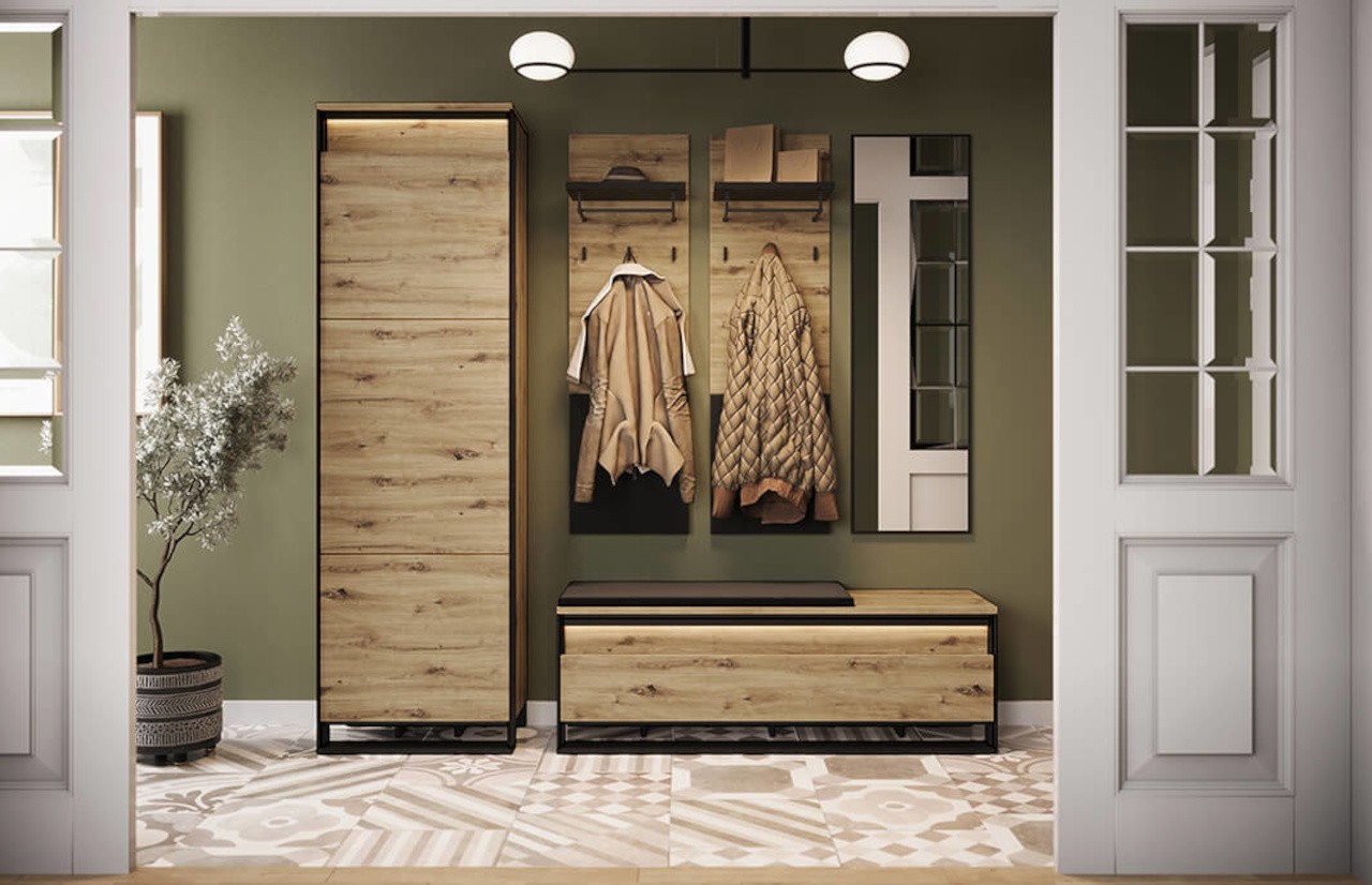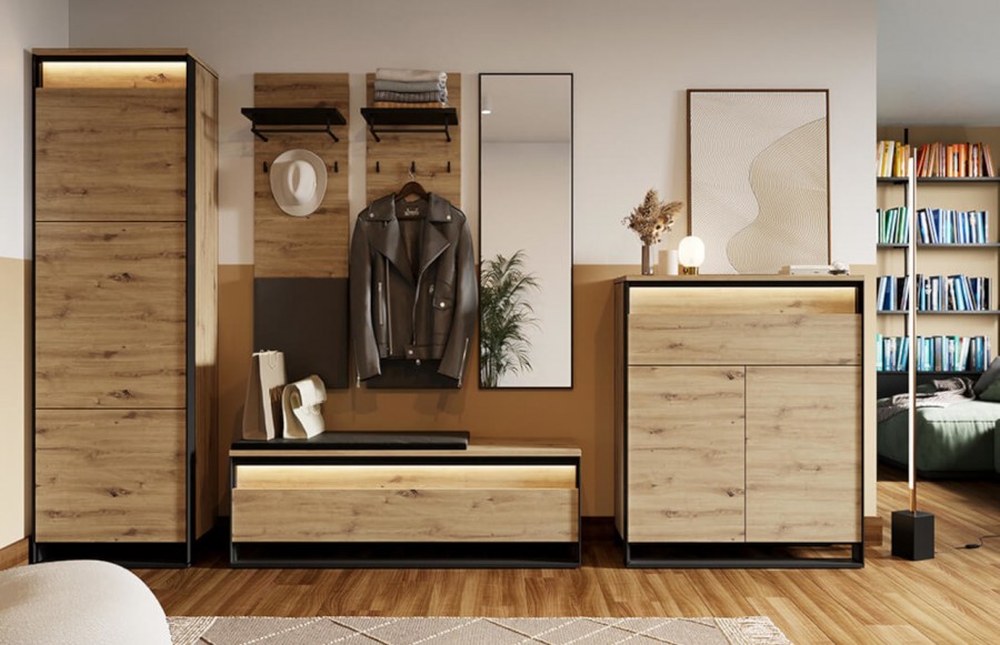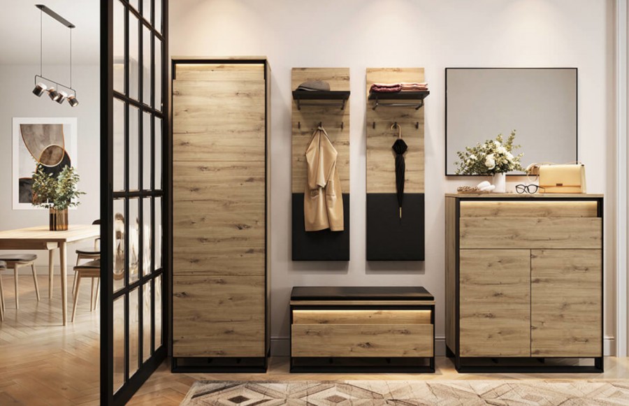 Przedpokój QUANT - aranżacja małego przedpokoju może być wyzwaniem, ale z odpowiednio dobranymi meblami i kreatywnym podejściem stanie się przestrzenią zarówno funkcjonalną, jak i stylową. Przedstawiamy garderobę do przedpokoju QUANT - idealne rozwiązanie dla miłośników industrialnego designu, którzy pragną stworzyć praktyczne i estetyczne wnętrze. Kombinacja eleganckiej czerni i ciepłego dekoru dębu artisan to nie tylko uniwersalne połączenie, które doskonale komponuje się z różnymi stylami aranżacji, ale również gwarancja ponadczasowego wyglądu. Meble z kolekcji QUANT wyposażono dodatkowo w oświetlenie LED, które subtelnie podkreśla przestrzenny charakter frontów i tworzy przyjemny, nastrojowy klimat. Bezuchwytowe fronty sprawiają, że minimalistyczna forma mebli zachowuje swoją czystość i elegancję. Sprytne schowki, pojemne szuflady i szafki zapewniają mnóstwo miejsca na przechowywanie, nawet w niewielkim przedpokoju. Dzięki kolekcji QUANT możesz cieszyć się nie tylko funkcjonalnością, ale także wyjątkowym stylem każdego dnia po przekroczeniu progu mieszkania.
