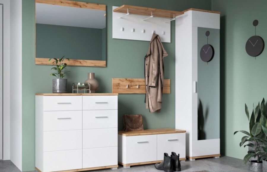 Przedpokój HOLA - to synonim efektownego luksusu, gdzie nowoczesna prostota harmonizuje z elegancką bielą, połyskiem i ponadczasowym drewnianym wykończeniem. Stwórz nowoczesną oazę luksusu w swoim przedpokoju dzięki kolekcji HOLA. Nawet w niewielkich przestrzeniach uzyskasz niezrównany efekt. Nowoczesna prostota mebli podkreśla perfekcyjną aranżację, która nie tylko optycznie powiększa przestrzeń, ale również tworzy jasny, uporządkowany wystrój. Kolekcja HOLA została zaprojektowana z myślą o doskonałym przechowywaniu odzieży i obuwia, oferując różnorodne, praktyczne szafki na buty, stylowe wieszaki, lustra, komody, szafy i funkcjonalne półki, umożliwiające optymalne wykorzystanie przestrzeni zarówno w małych przedpokojach, jak i przestronnych holach. Wykonane z wysokiej jakości płyty meblowej, meble z kolekcji HOLA gwarantują nie tylko estetykę, ale także komfort użytkowania. Podkreśl nowoczesny charakter swojego przedpokoju dzięki kolekcji HOLA, łączącej doskonałą funkcjonalność z niepowtarzalnym designem.