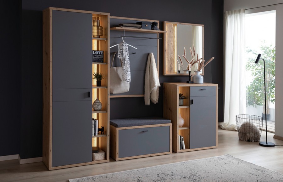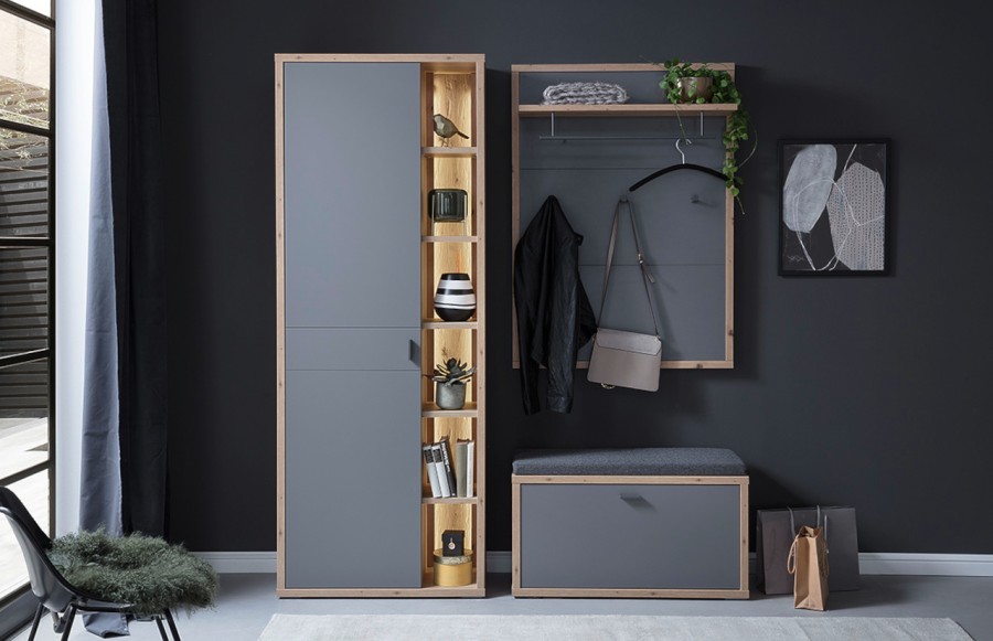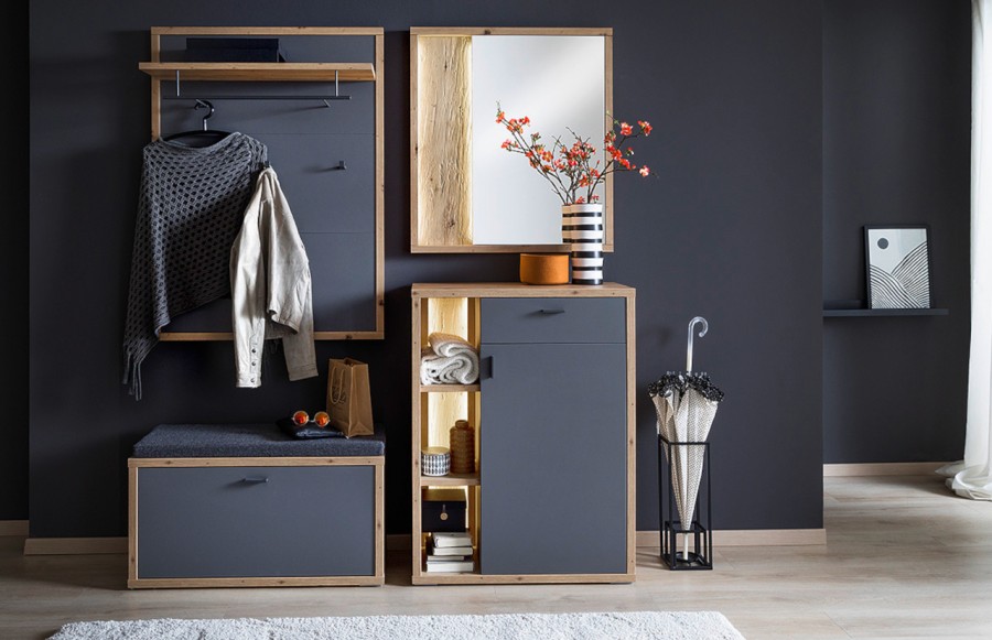 Przedpokój LIZZANO - to synonim wysokiej jakości i elegancji w aranżacji przedpokoju. Został stworzony z dbałością o detale, wykorzystując wyłącznie materiały najwyższej jakości. Korpusy mebli pokryte są melaminą w ciepłym odcieniu dębu, a fronty w stonowanym matowym szarym, co nadaje im nowoczesny, uniwersalny charakter. Metalowe uchwyty w antracytowym kolorze dodają kolekcji wyrafinowanego wykończenia. System LIZZANO oferuje różnorodne elementy, umożliwiając łatwe i wszechstronne urządzenie nowoczesnego przedpokoju: ławka z funkcjonalną klapą, przestronna szafa garderobiana, praktyczna komoda, panel ścienny z półką i drążkiem oraz eleganckie lustro. System LIZZANO to nie tylko praktyczność, ale również styl. Jeśli poszukujesz mebli, które nie tylko ułatwią codzienne funkcjonowanie, ale także nadadzą Twojemu przedpokoju nowoczesnego charakteru, to kolekcja LIZZANO spełni Twoje oczekiwania.