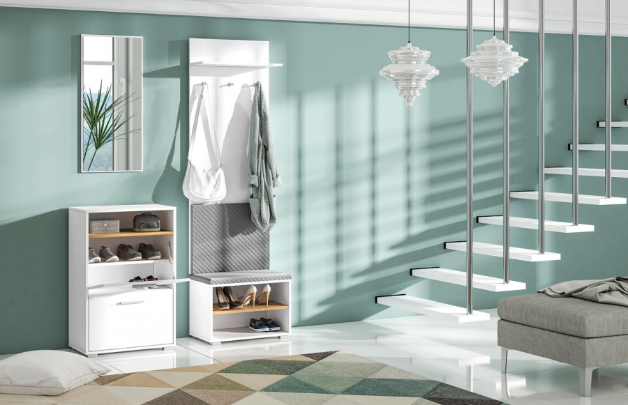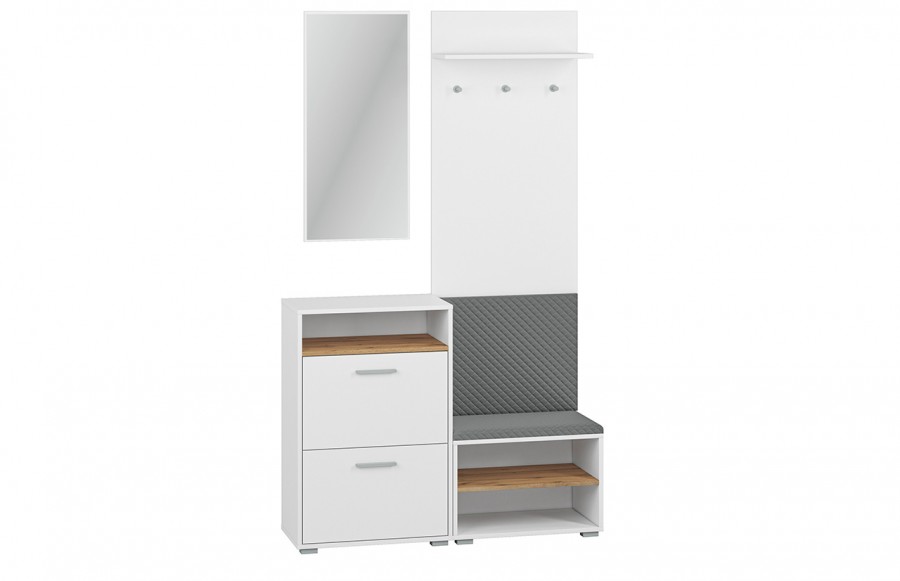 Przedpokój LORET - to niezawodne rozwiązanie, które idealnie wkomponuje się w każde wnętrze. Zapewni optymalną organizację przestrzeni oraz wygodę codziennego użytkowania. Klasyczne, eleganckie białe meble w połączeniu z dębowymi półkami i subtelnym akcentem w odcieniu grafitu tworzą propozycję doskonałą dla małych oraz dużych holów. Zestaw mebli LORET to kompletna propozycja, która zawiera lustro, panel z praktycznymi wieszakami na okrycia wierzchnie oraz dwie funkcjonalne szafki na buty. Koncepcja przedpokoju LORET to nie tylko meble, ale także zaproszenie do wnętrza pełnego harmonii i funkcjonalności. Kolekcja LORET to propozycja dla tych, którzy pragną połączyć estetykę z praktycznym rozwiązaniem.