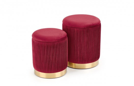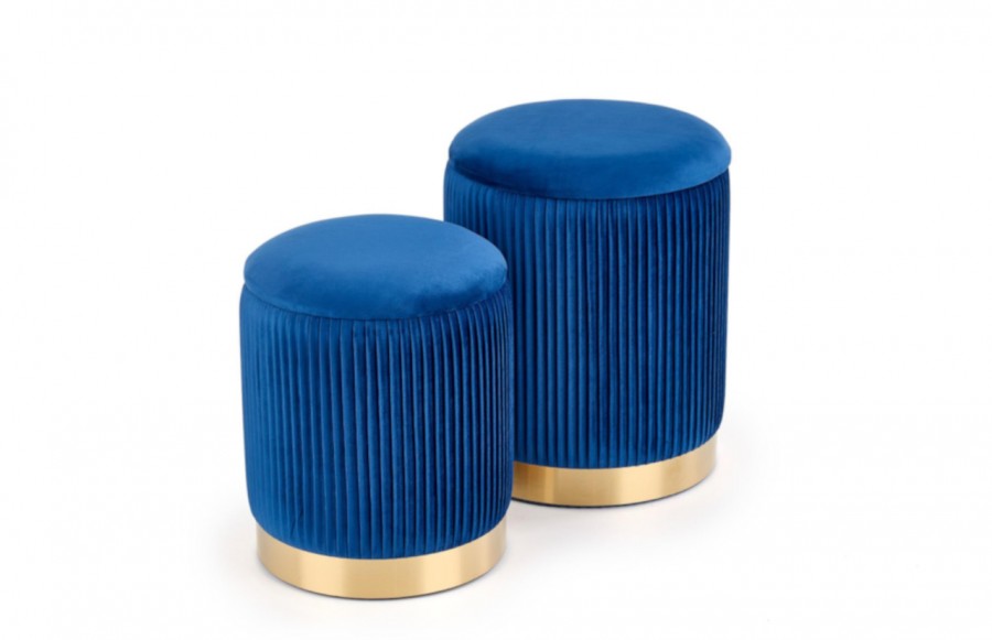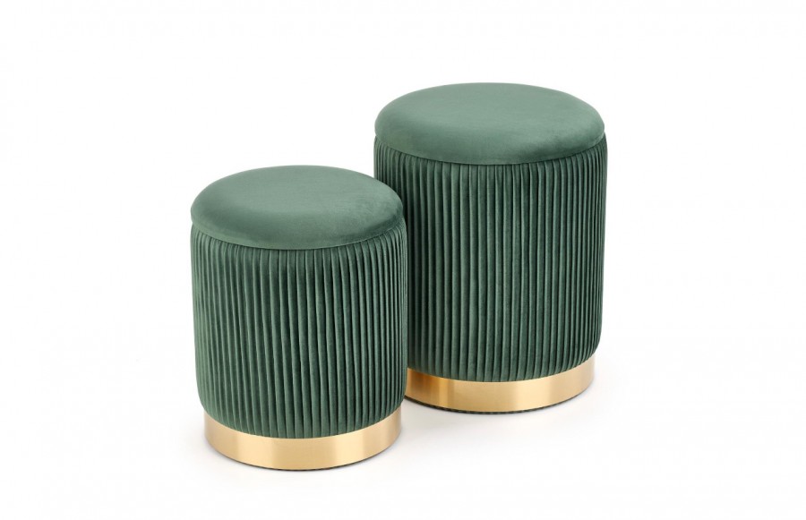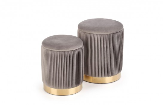 Zestaw puf MONTY - zestaw idealnie wpasuje się we wnętrza w stylu glamour. Wykończenie ekskluzywną tkaniną velvetową w połączeniu ze złotą podstawą nadaje jej eleganckiego i ekskluzywnego wyglądu. Zestaw składa się z dwóch puf, które zaprojektowane zostały tak aby mniejsza z nich mogła być przechowywana w większej. MONTY mogą pełnić funkcję siedziska w salonie, przedpokoju jak i schowka na drobiazgi.