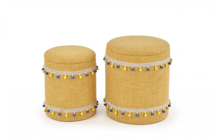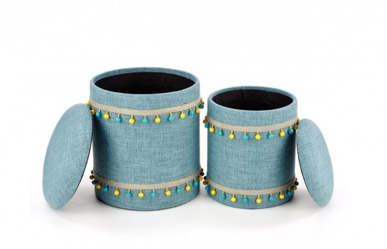 Zestaw puf GRADO - przypadnie do gustu osobom ceniącym sobie niebanalne wnętrza. W skład zestawu wchodzą dwie pufy tapicerowane praktyczną i wytrzymałą tkaniną, wzbogaconą o zdobienie w postaci kolorowych pomponów. Pufy ze schowkiem to idealny dodatek do każdej przestrzeni, który pozwoli na przechowywanie drobnych przedmiotów czy zabawek. Zestaw puf doskonale sprawdzi się we wnętrzach nowoczesnych, klasycznych, a szczególnie we wnętrzach typu boho.