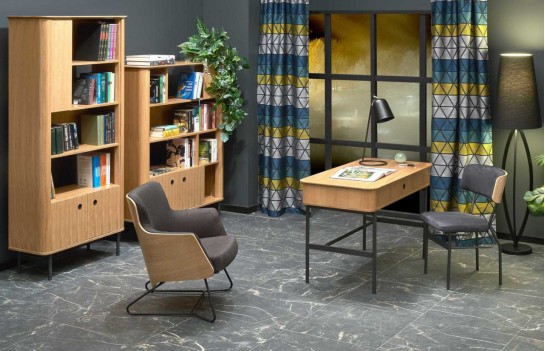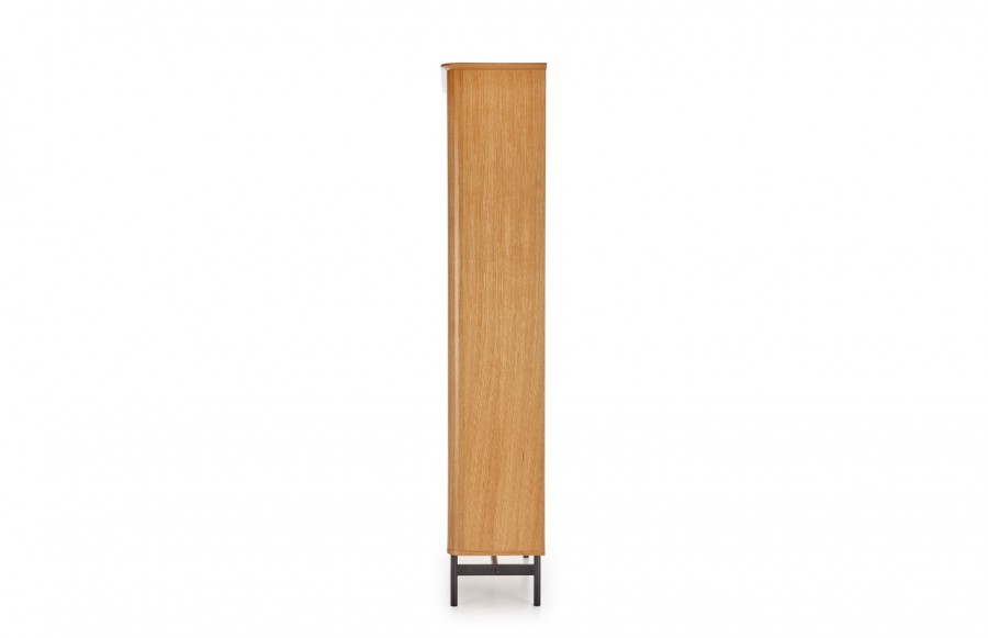 Regał SMART 01 - to nie tylko funkcjonalny, ale także elegancki mebel retro, doskonały do salonu, sypialni czy biura. Wykonany z wysokiej jakości forniru, zapewnia trwałość i odporność na uszkodzenia. Z paroma półkami i szafką, umożliwia przechowywanie różnych przedmiotów, od książek po dekoracje. Dzięki unikalnej formie i charakterystycznemu wyglądowi, regał może stanowić interesujący akcent w nowoczesnych wnętrzach, nadając im niepowtarzalnego stylu. Dodatkowym elementem są czarne, stalowe nóżki malowane proszkowo, które dodają regałowi surowości i charakteru.